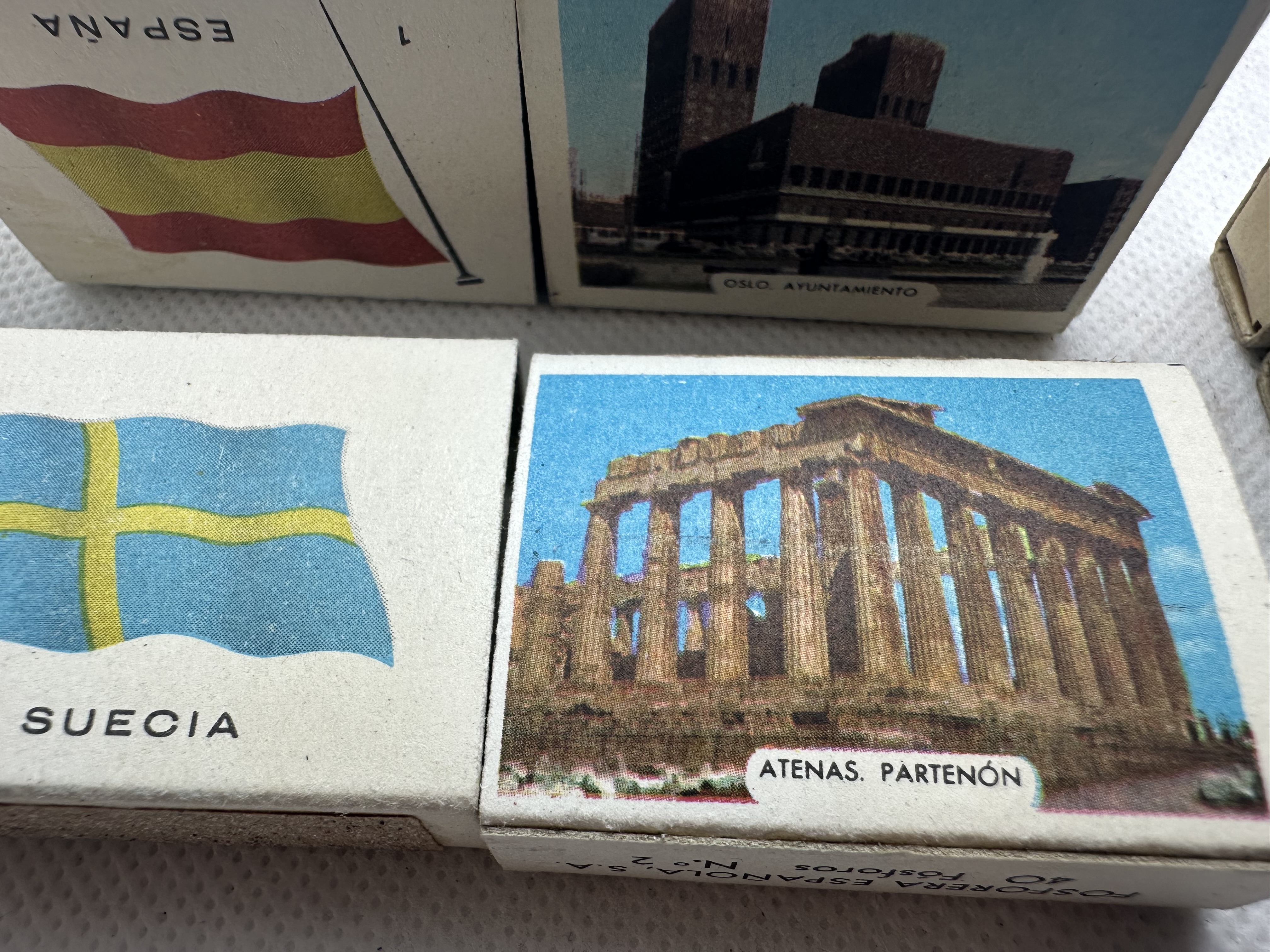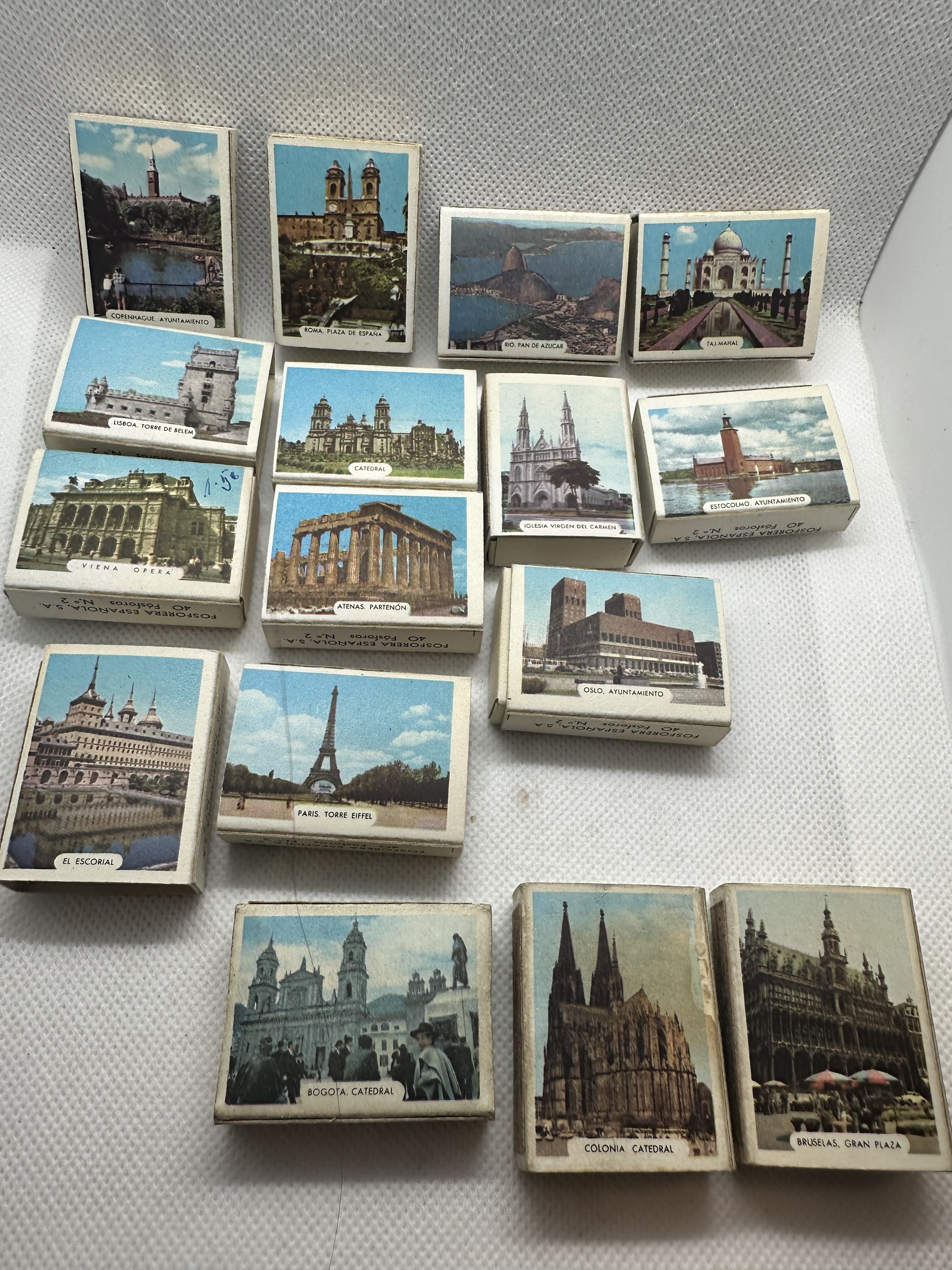 16 Stk. verschiedene antike Zündholzschachteln aus Spanien - Firma Fosforera - Thema Sehenswürdigkeiten versch. Länder- für SAMMLER! 13 Stk davon sind neu und 3 Stk. sind gebraucht - siehe Fotos
