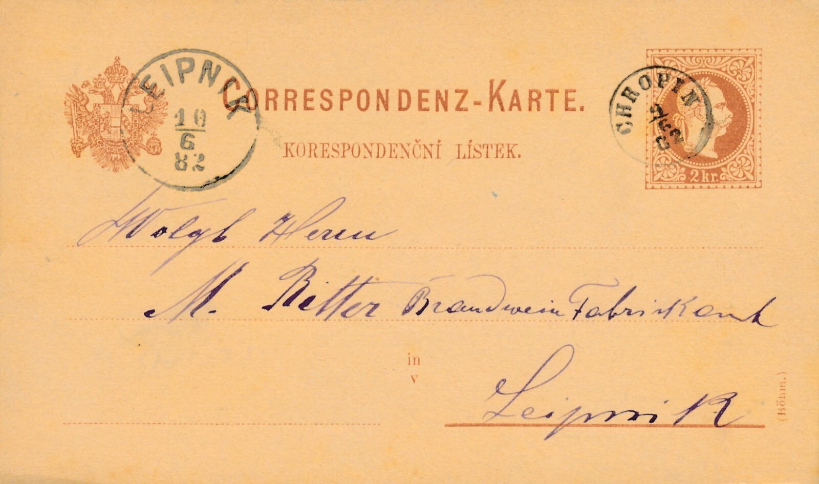 2 Kreuzer - Ganzsachen - Karte 1882 aus Chropin (10163)