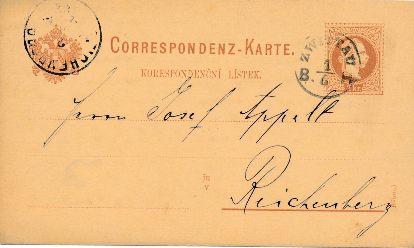 2 Kreuzer - Ganzsachen - Karte 1882 aus Zwittau (10078)