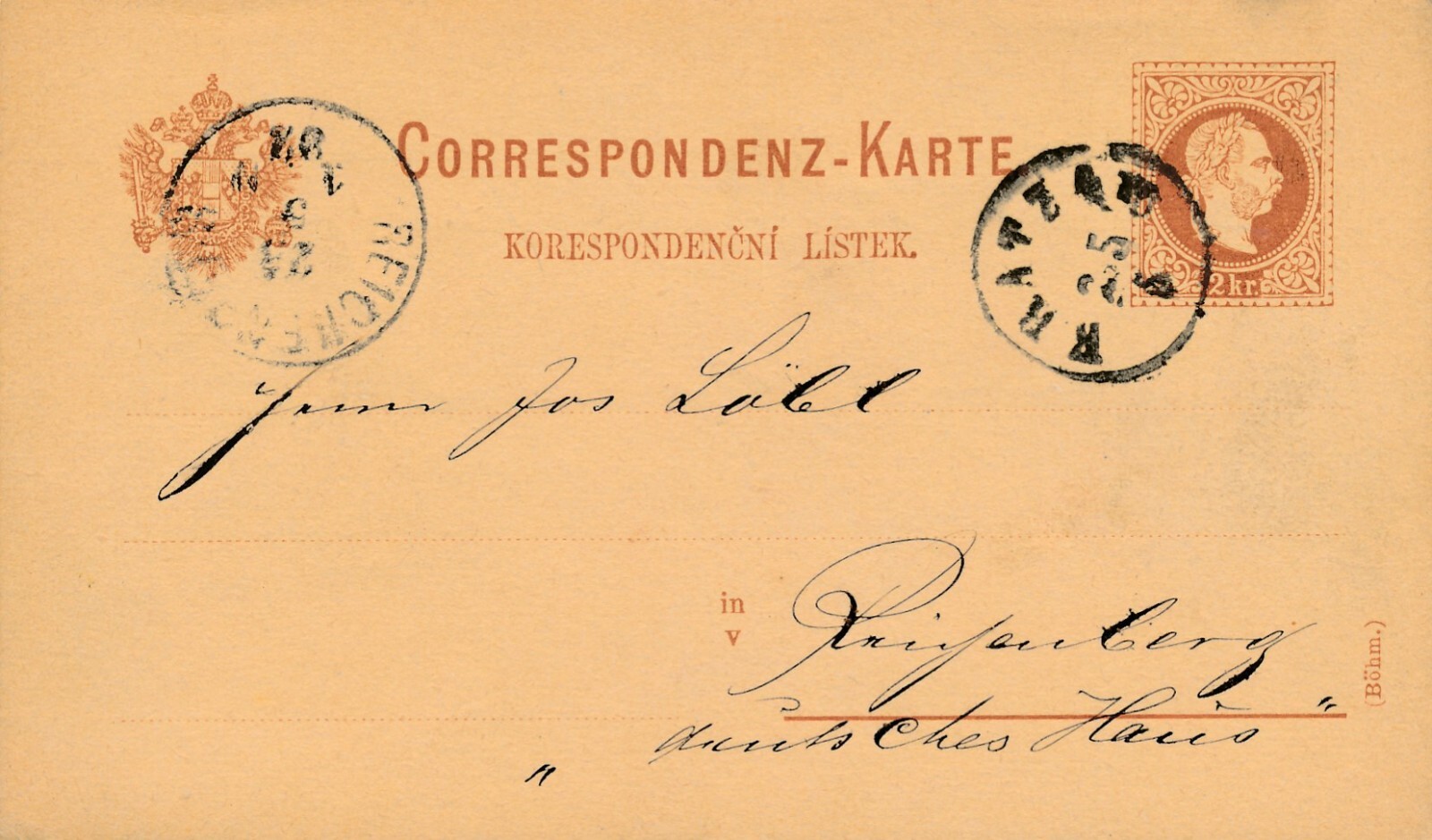2 Kreuzer - Ganzsachen - Karte 1887 aus Kratzau (13581)