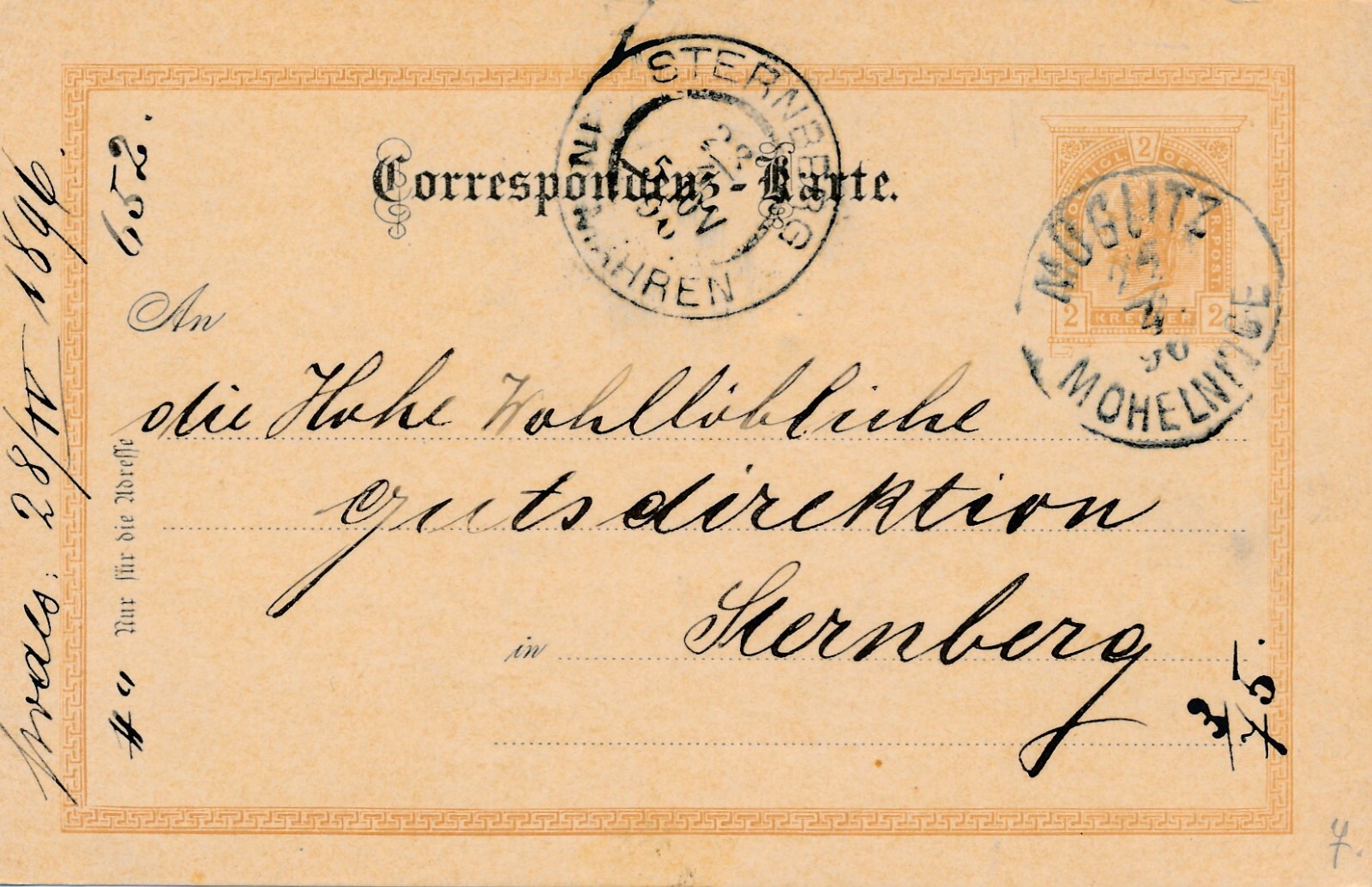 2 Kreuzer - Ganzsachen - Karte aus Mähr Schönberg (10185)