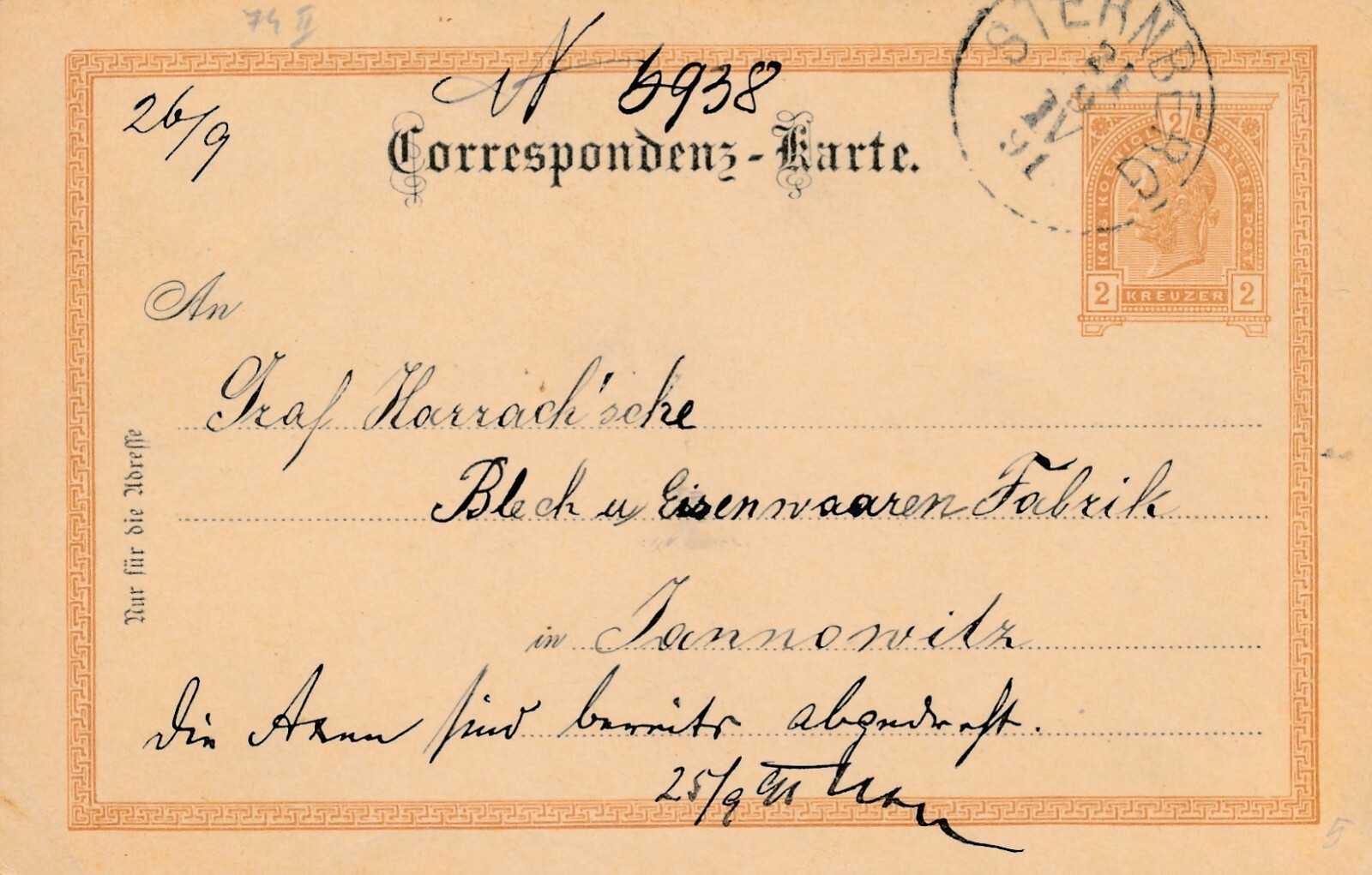 2 Kreuzer - Ganzsachen - Karte aus Brünn Bahnhof (16220)