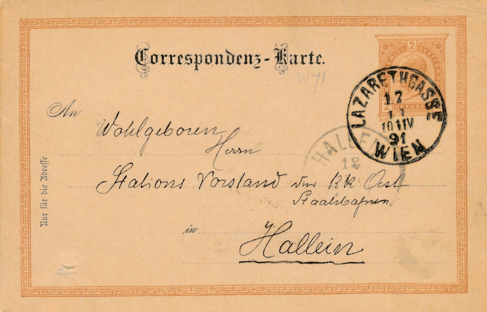 2 Kreuzer Ganzsachen - Karte 1891 aus Wien Lazarethgasse (11173)
