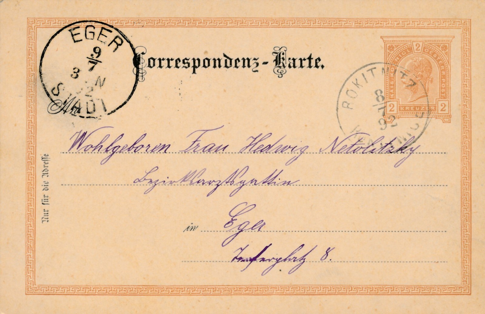 2 Kreuzer - Ganzsachen - Karte 1892 aus Rokitnitz (10697)