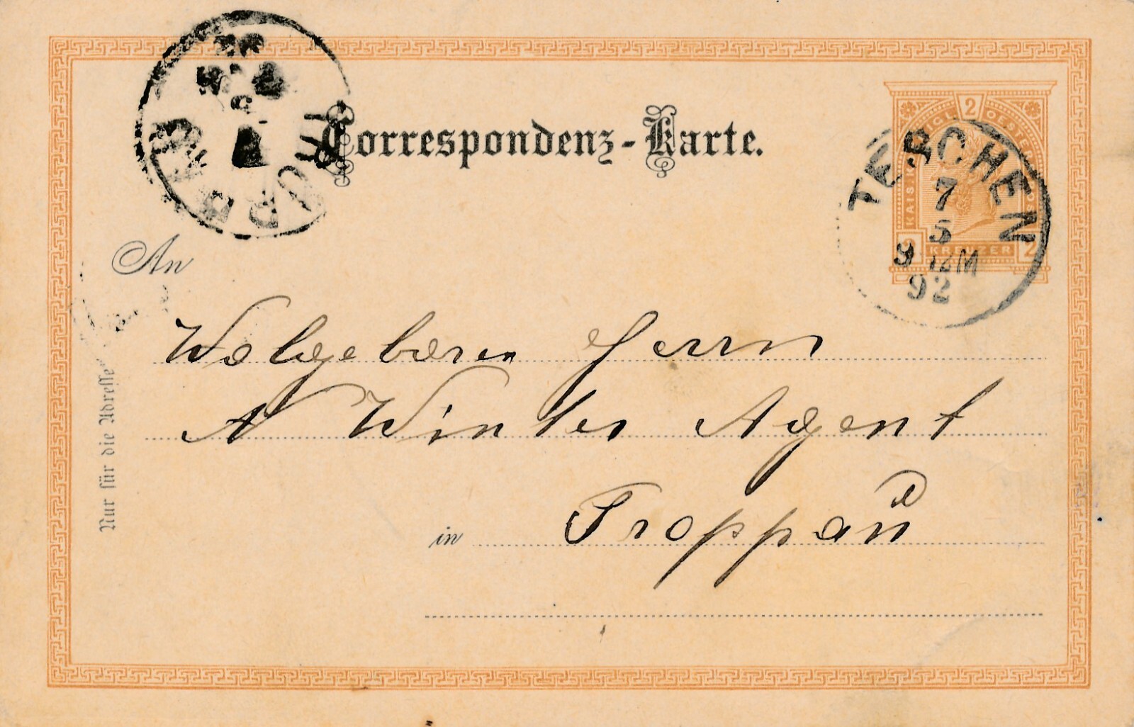 2 Kreuzer - Ganzsachen - Karte 1892 aus Teschen (10695)