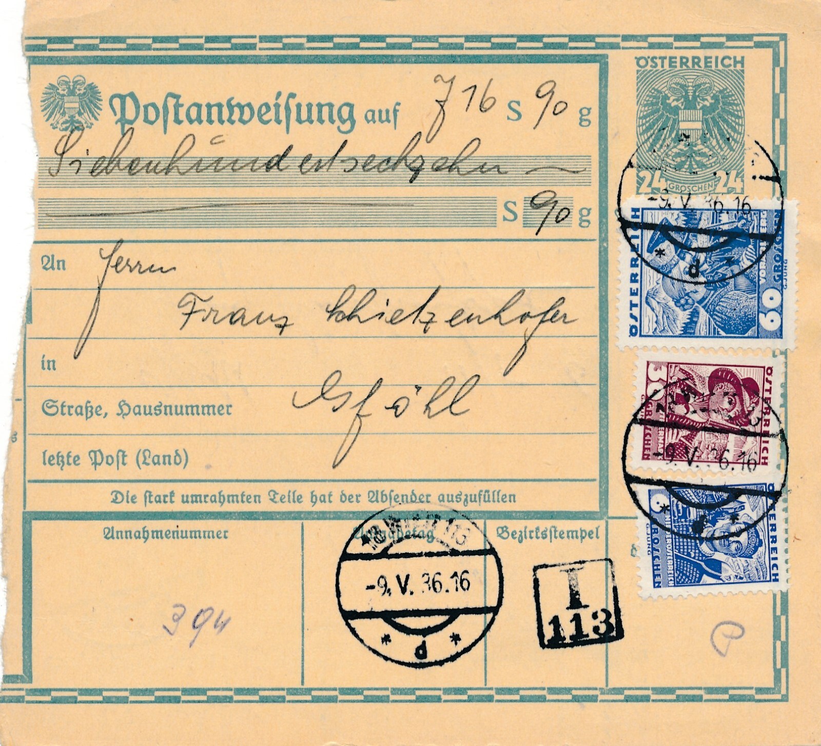 24 Gr. Postanweisung 1936 aus Wien nach Spittal + Trachten Marken (10409)