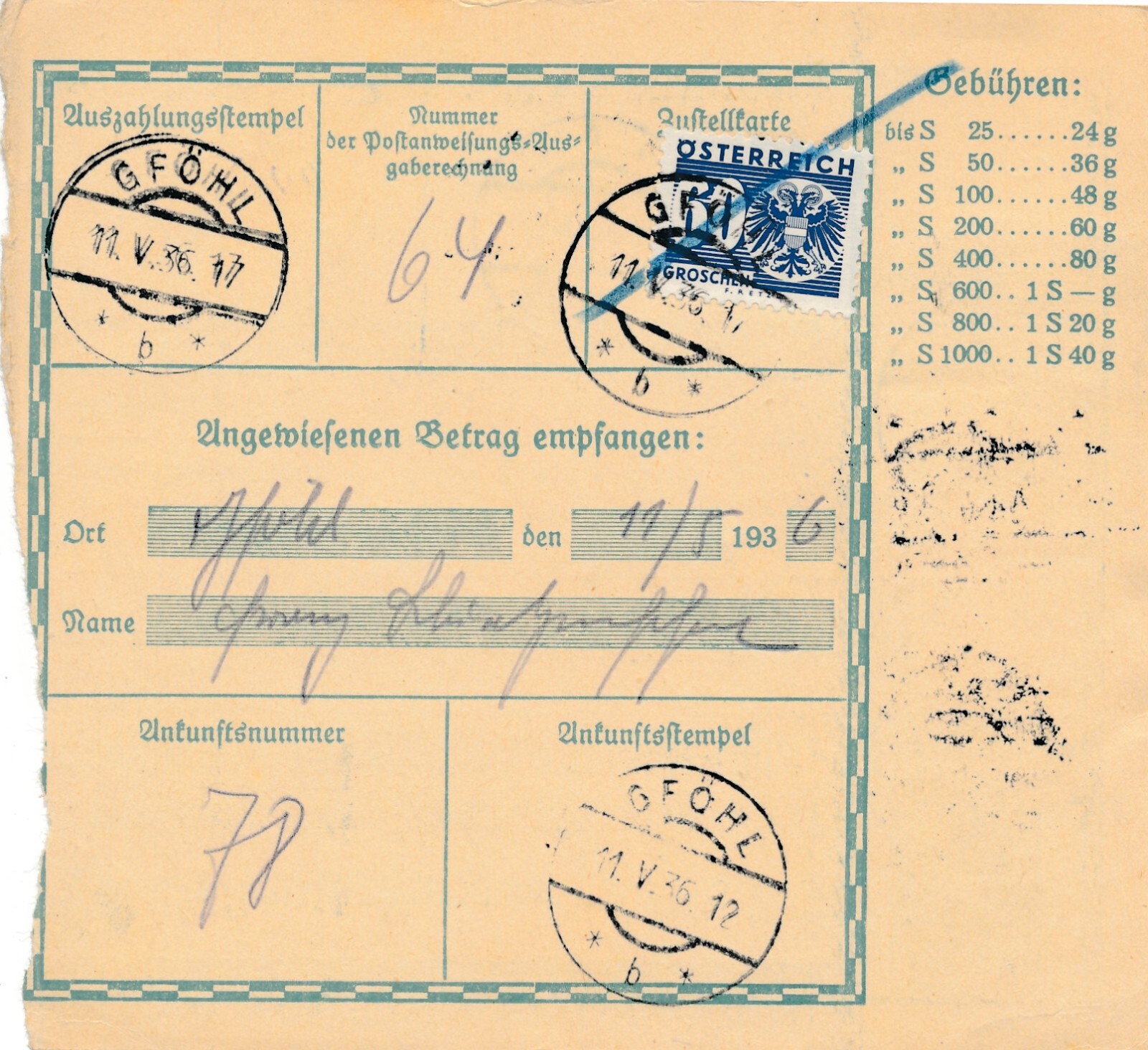 24 Gr. Postanweisung 1936 aus Wien nach Gföhl + Trachten Marken (10411)
