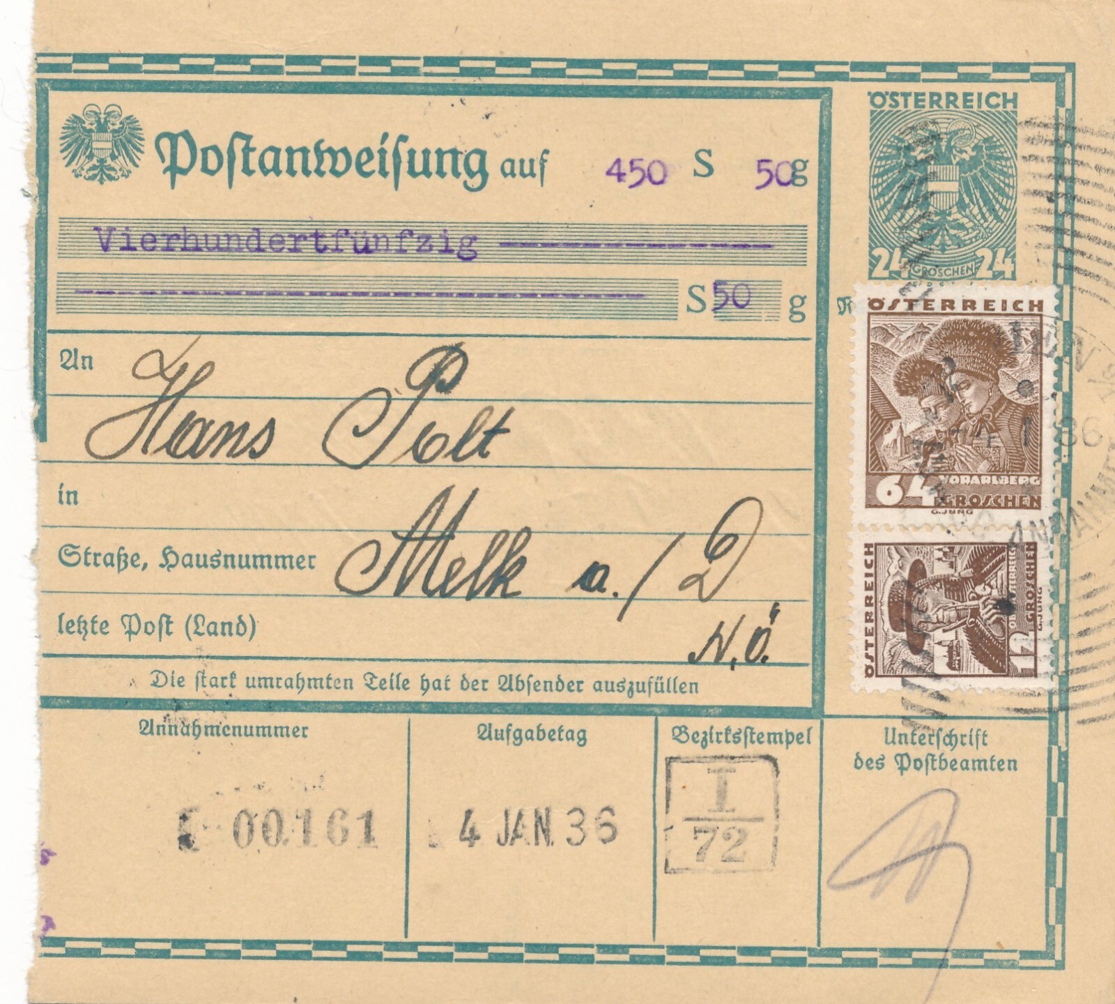 24 Gr. Postanweisung 1936 aus Wien nach Melk + Trachten Marken (10436)