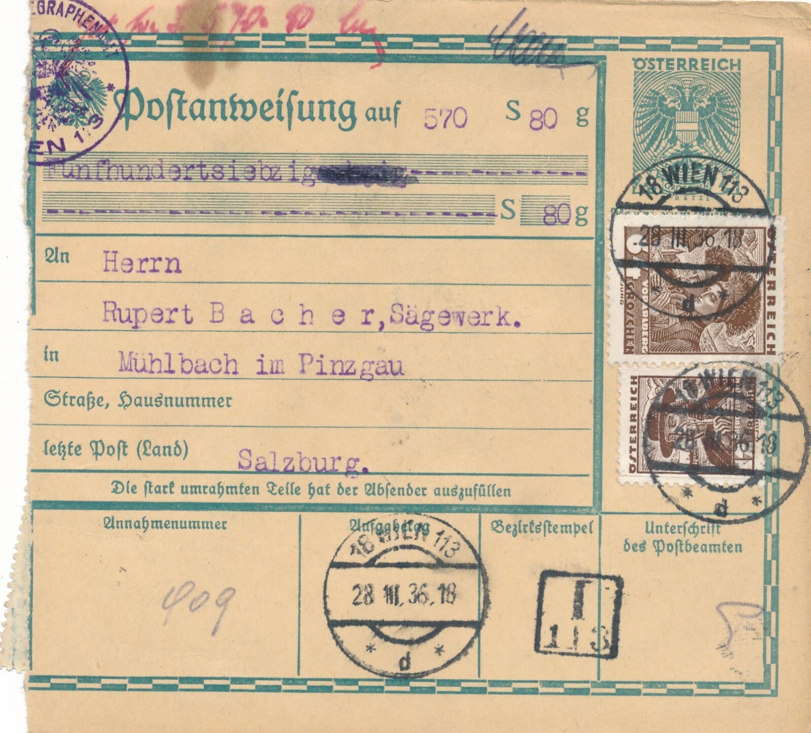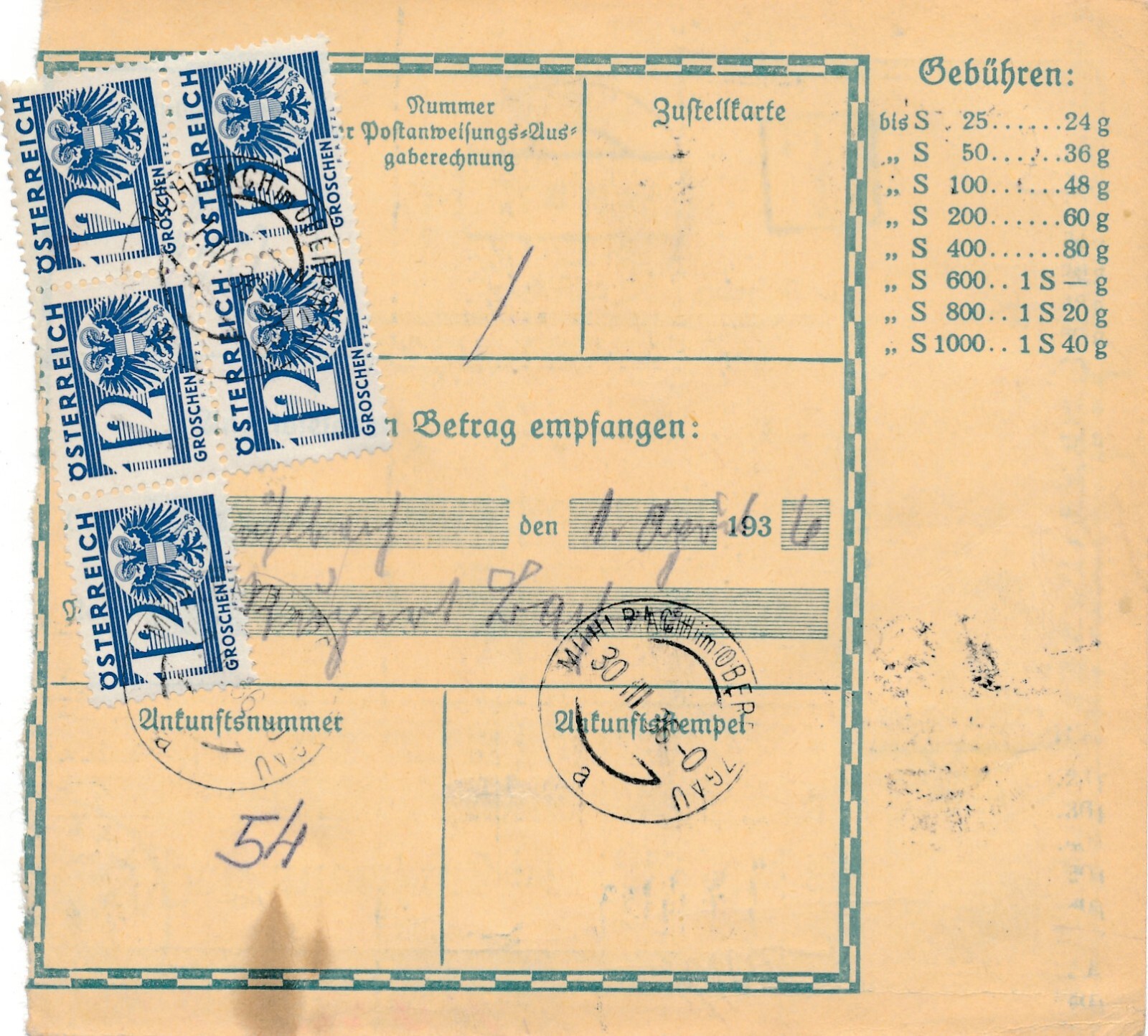 24 Gr. Postanweisung 1936 aus Wien nach Mühlbach + Trachten Marken (10401)