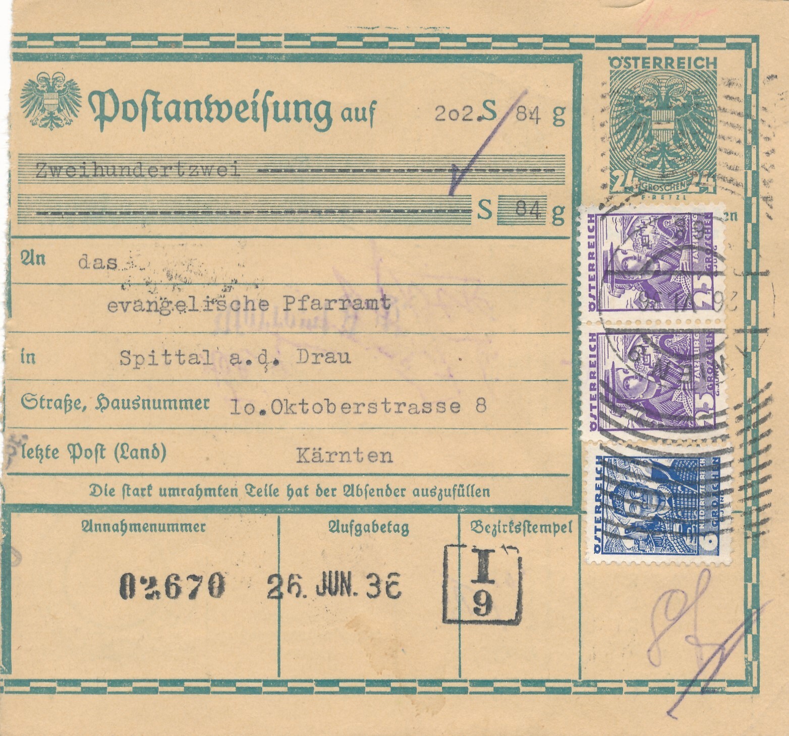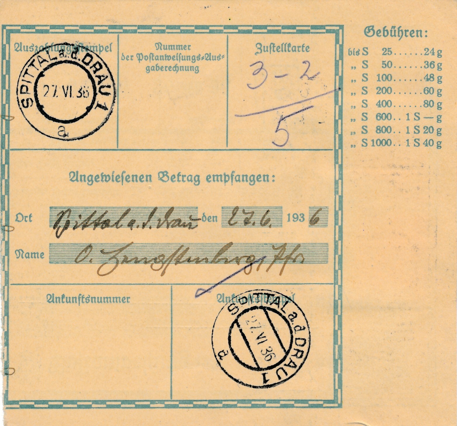 24 Gr. Postanweisung 1936 aus Wien nach Spittal + Trachten Marken (10409)