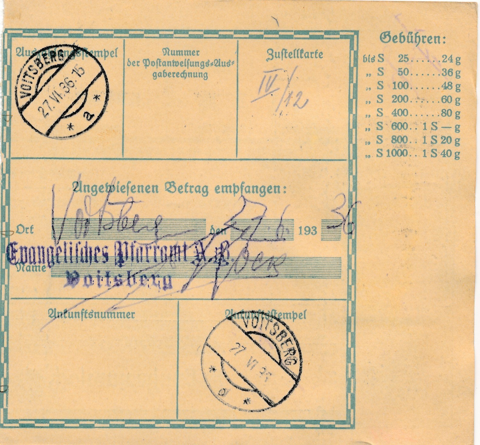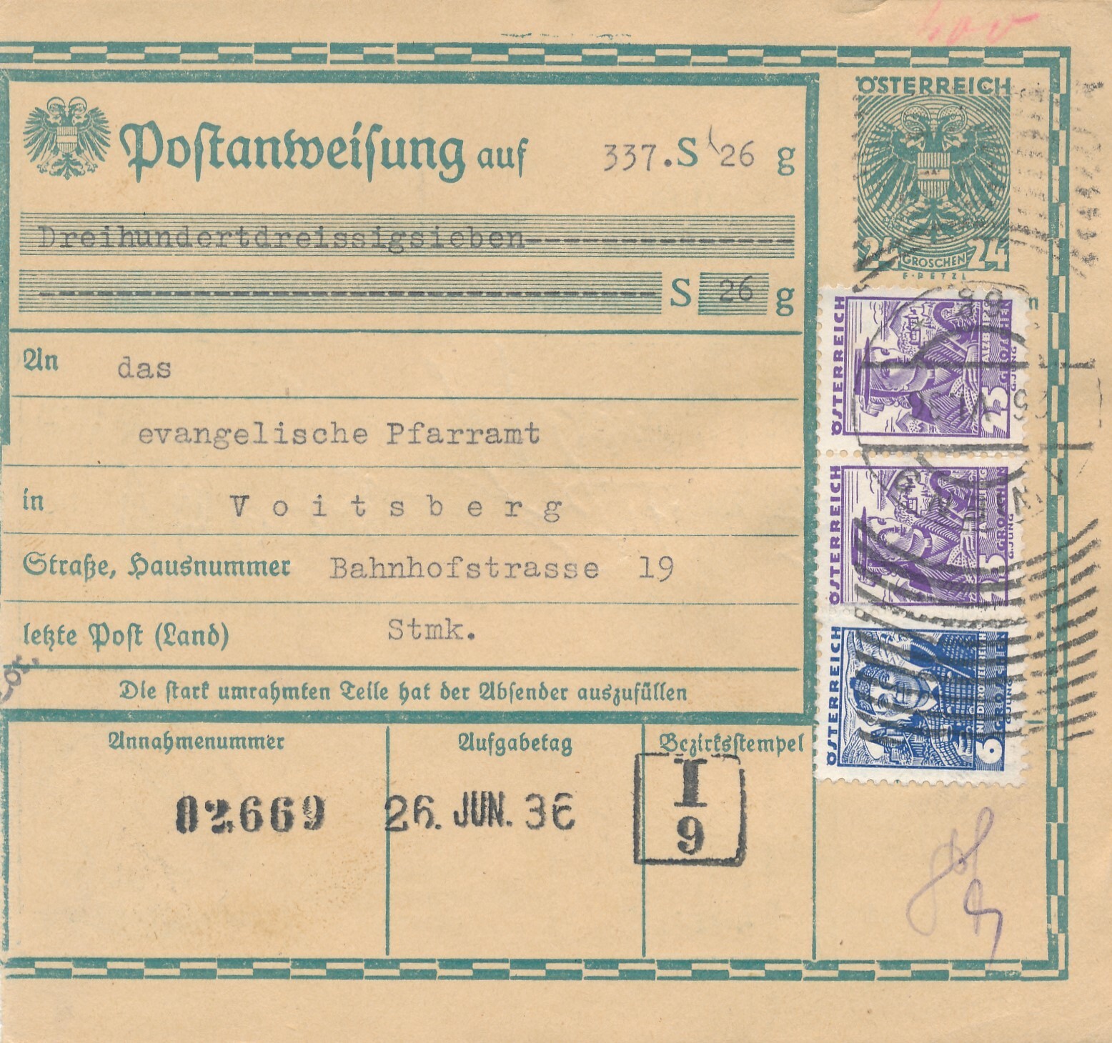 24 Gr. Postanweisung 1936 aus Wien nach Voitsberg + Trachten Marken (10410)