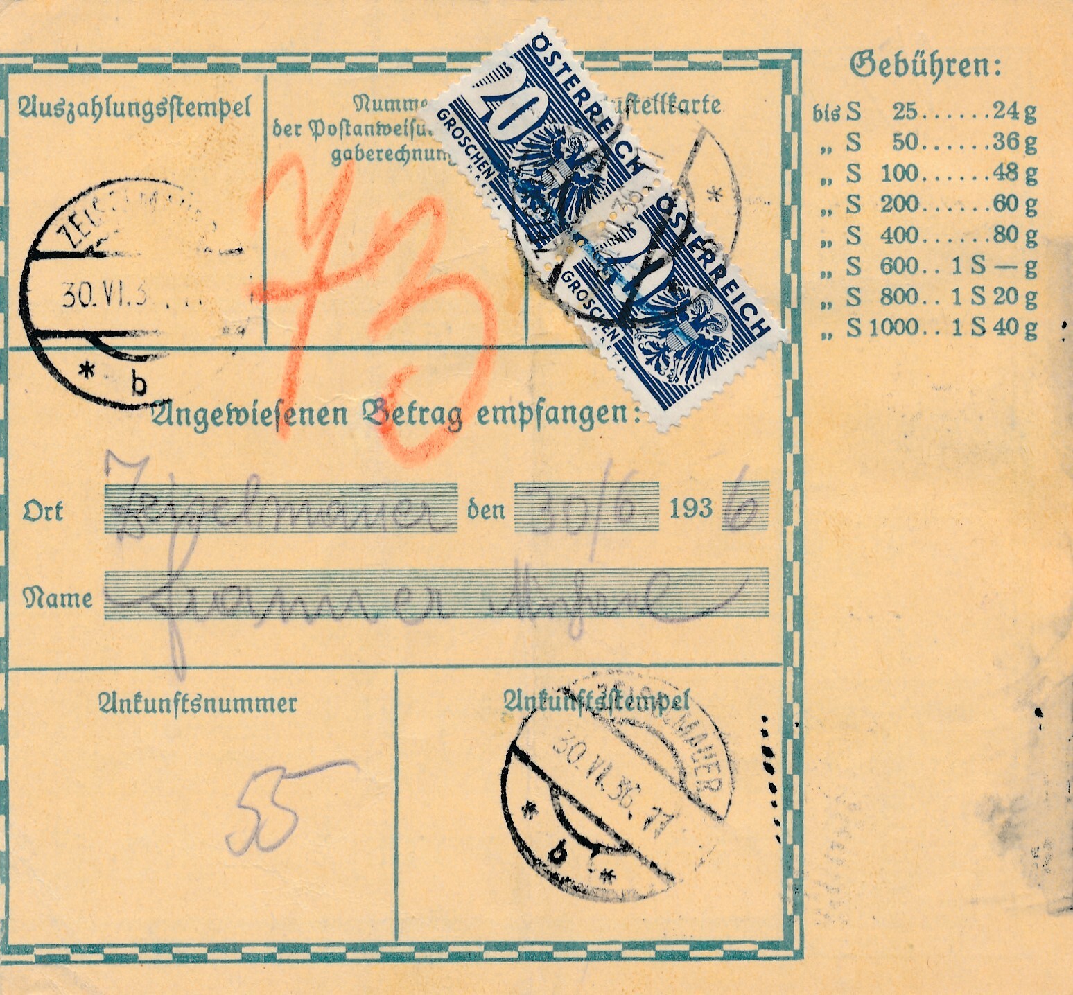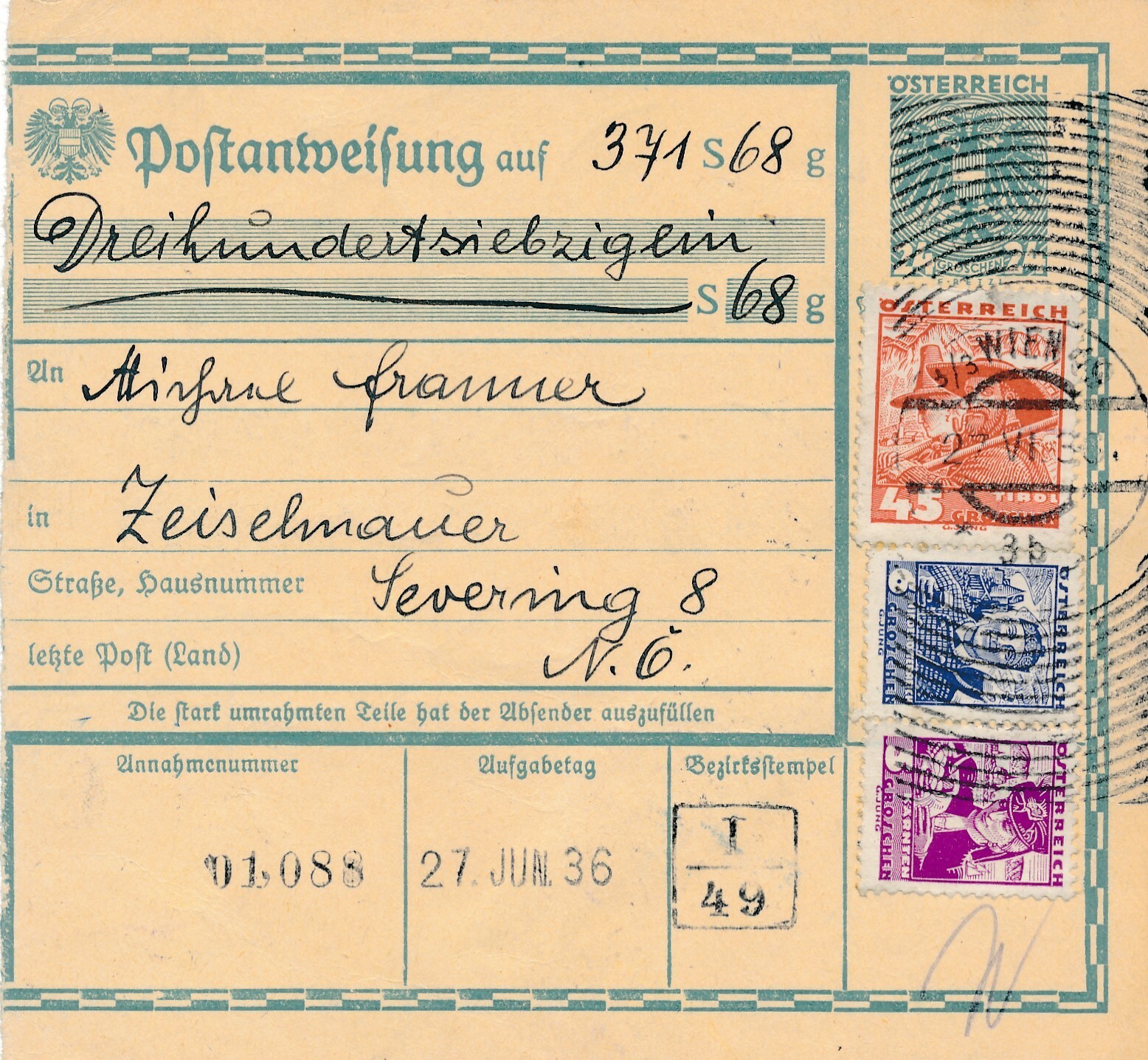 24 Gr. Postanweisung 1936 aus Wien nach Zeiselmauer + Trachten Marken (10439)