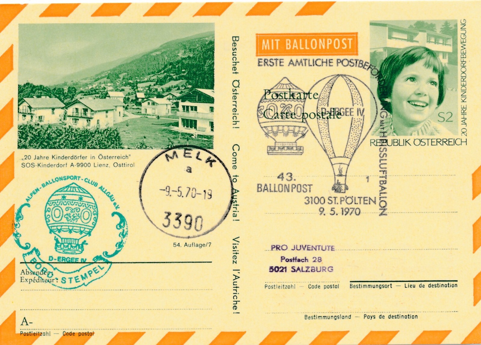 43. Ballonpost St. Pölten auf Bildpostkarte 1970 Lienz Osttirol (11500)