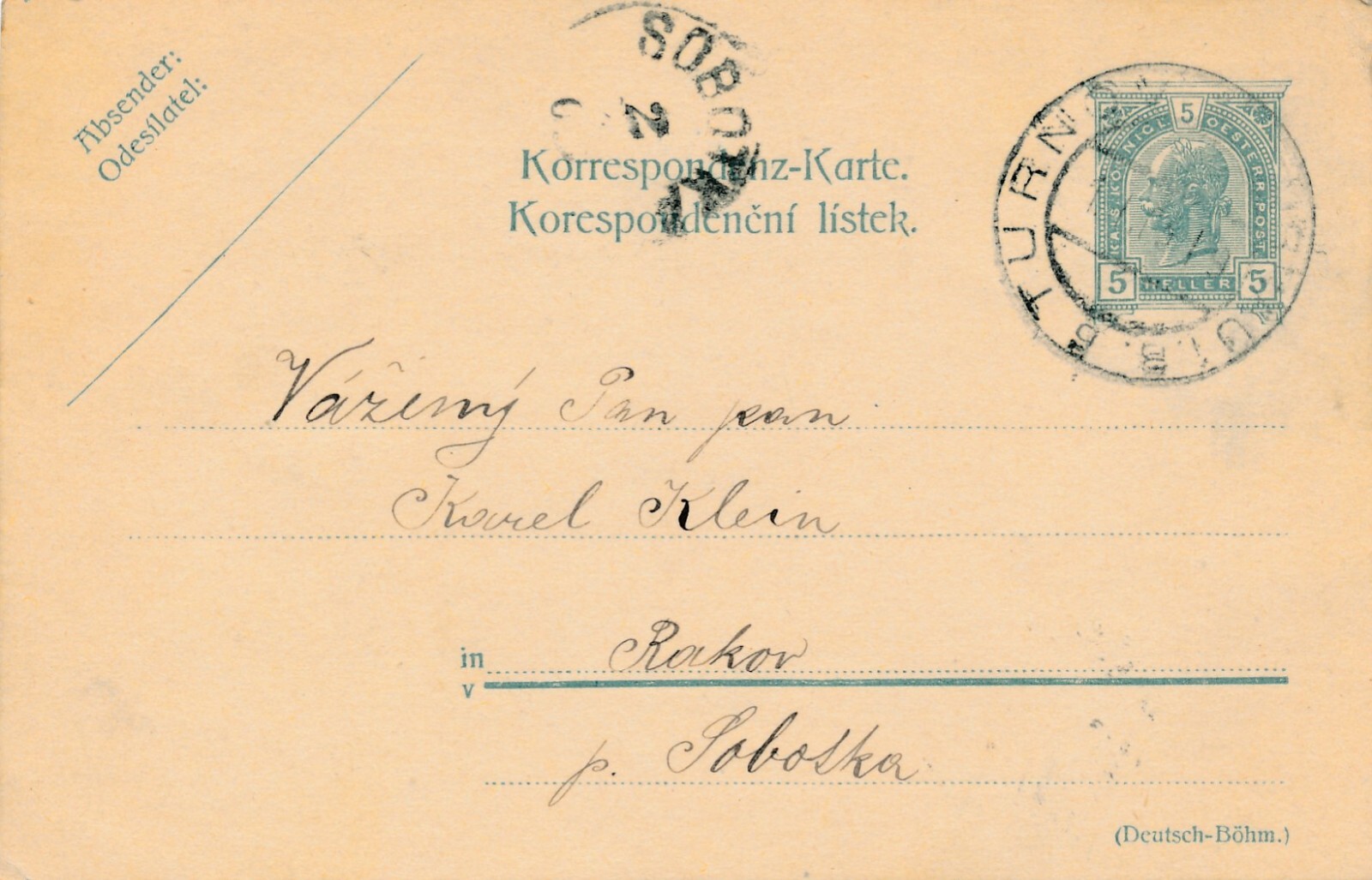 5 Heller Ganzsachen - Karte 1905 aus Turnov (10452)