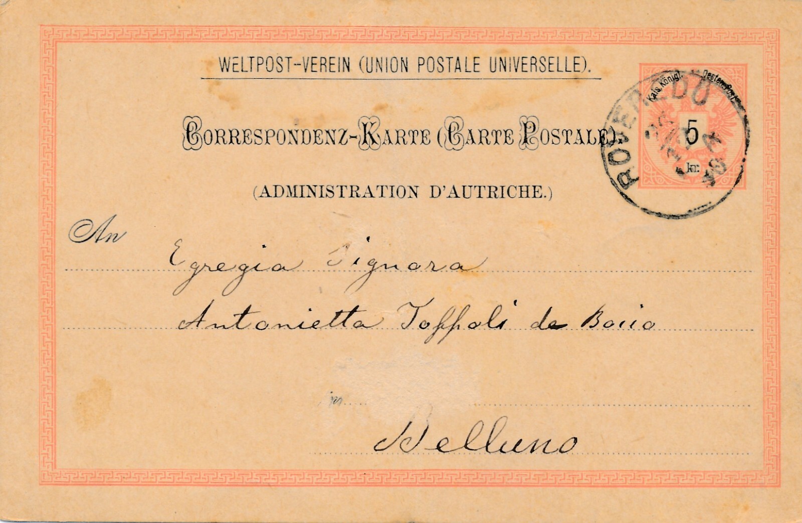 5 Kreuzer - Ganzsachen - Karte 1890 aus Roveredo (12319)