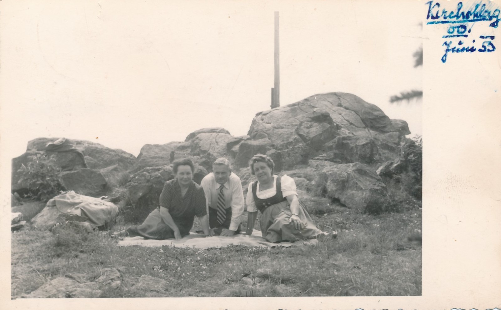 AK 2 Damen und ein Mann am Gipfelkreuz in Kirchschlag Annodazumals (15444)