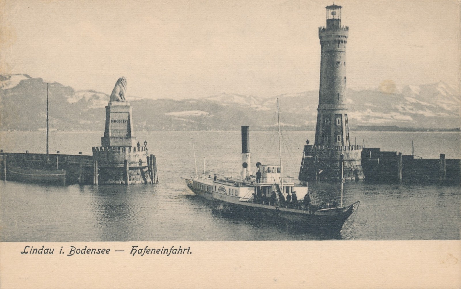 AK aus Lindau Bondensee Hafeneinfahrt mit Leuchtturm mit Dampfer (18321)