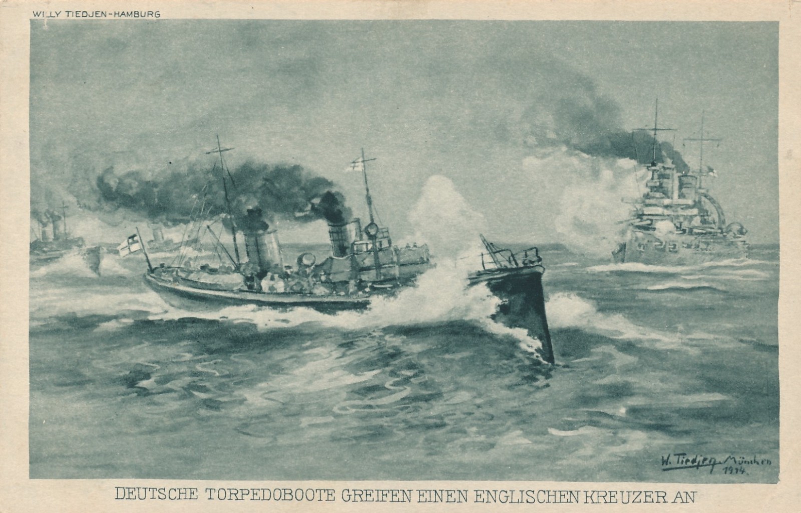 AK Deutsche Torpedoboote greifen Kreuzer an ,Schiffe Boote, (17054)
