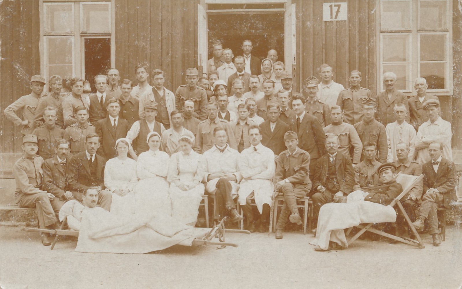 AK Mannschaftsfoto von Soldaten mit Verletzten Soldaten Militaria (14735)