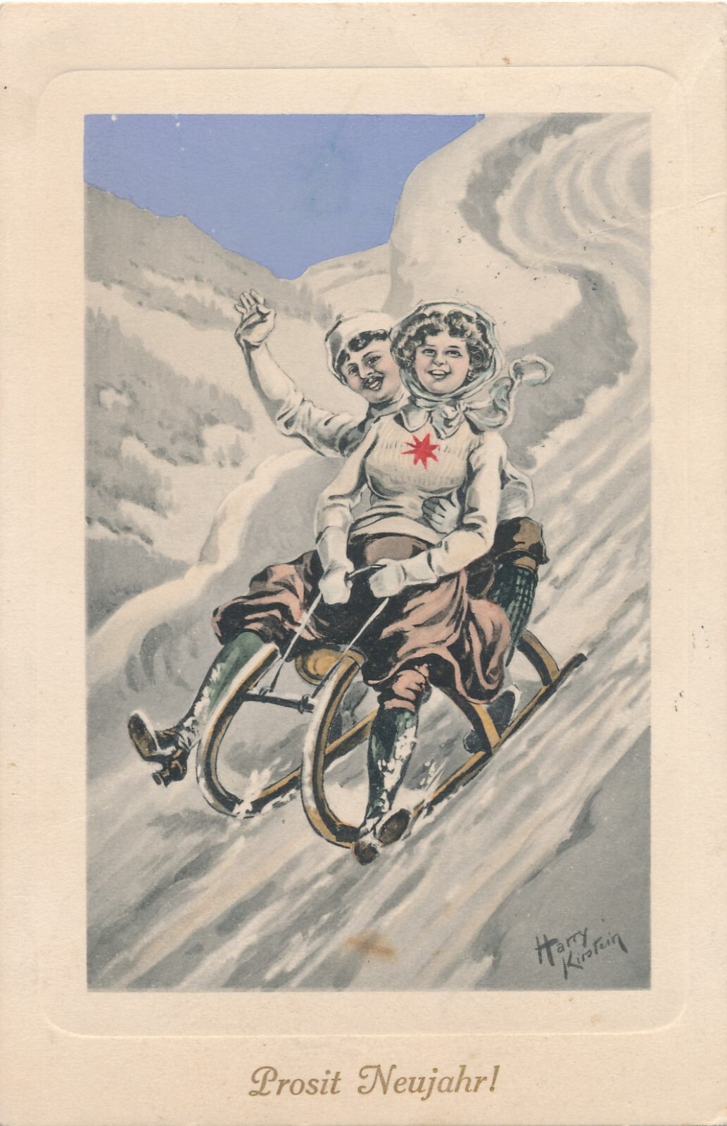 AK Prosit Neujahr zwei Frauen am Schlitten (7199)