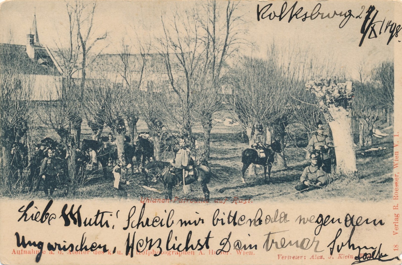 AK Uhlanen Patrouille auf Rast mit Pferden Ansichtskarte (13903)