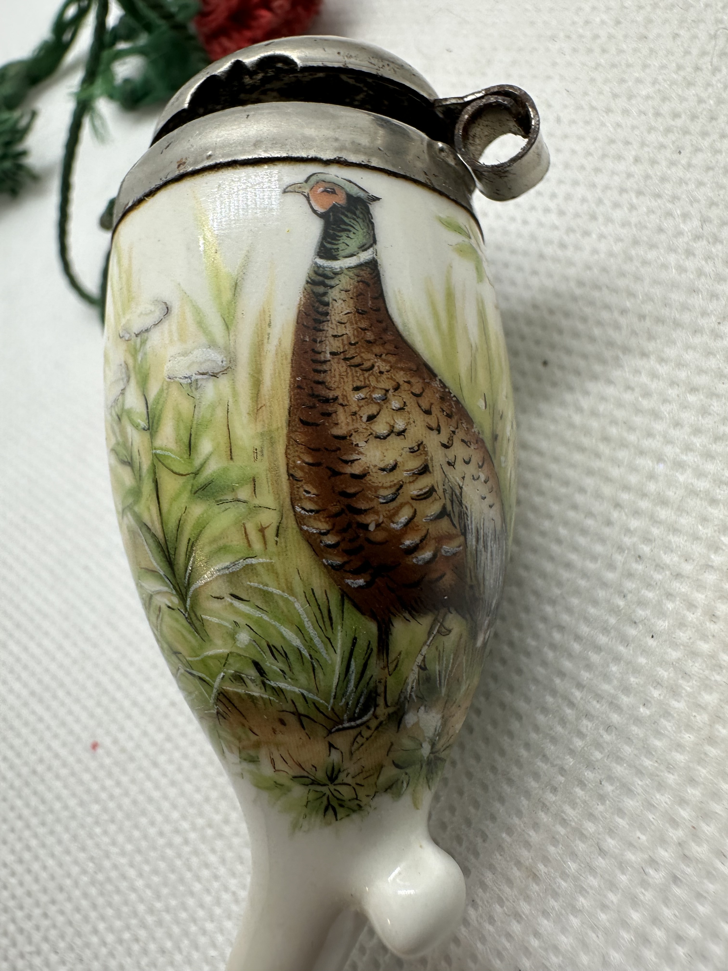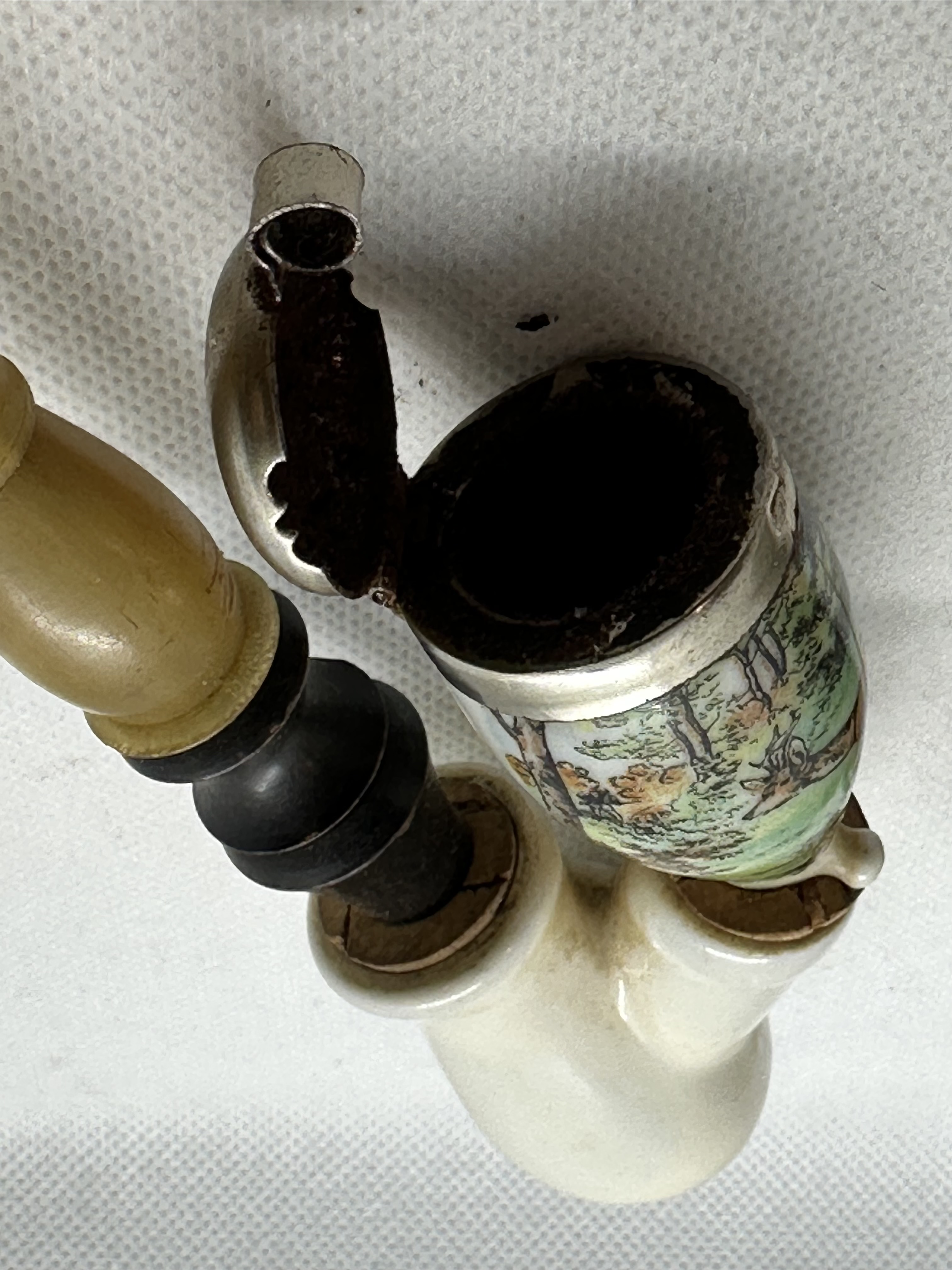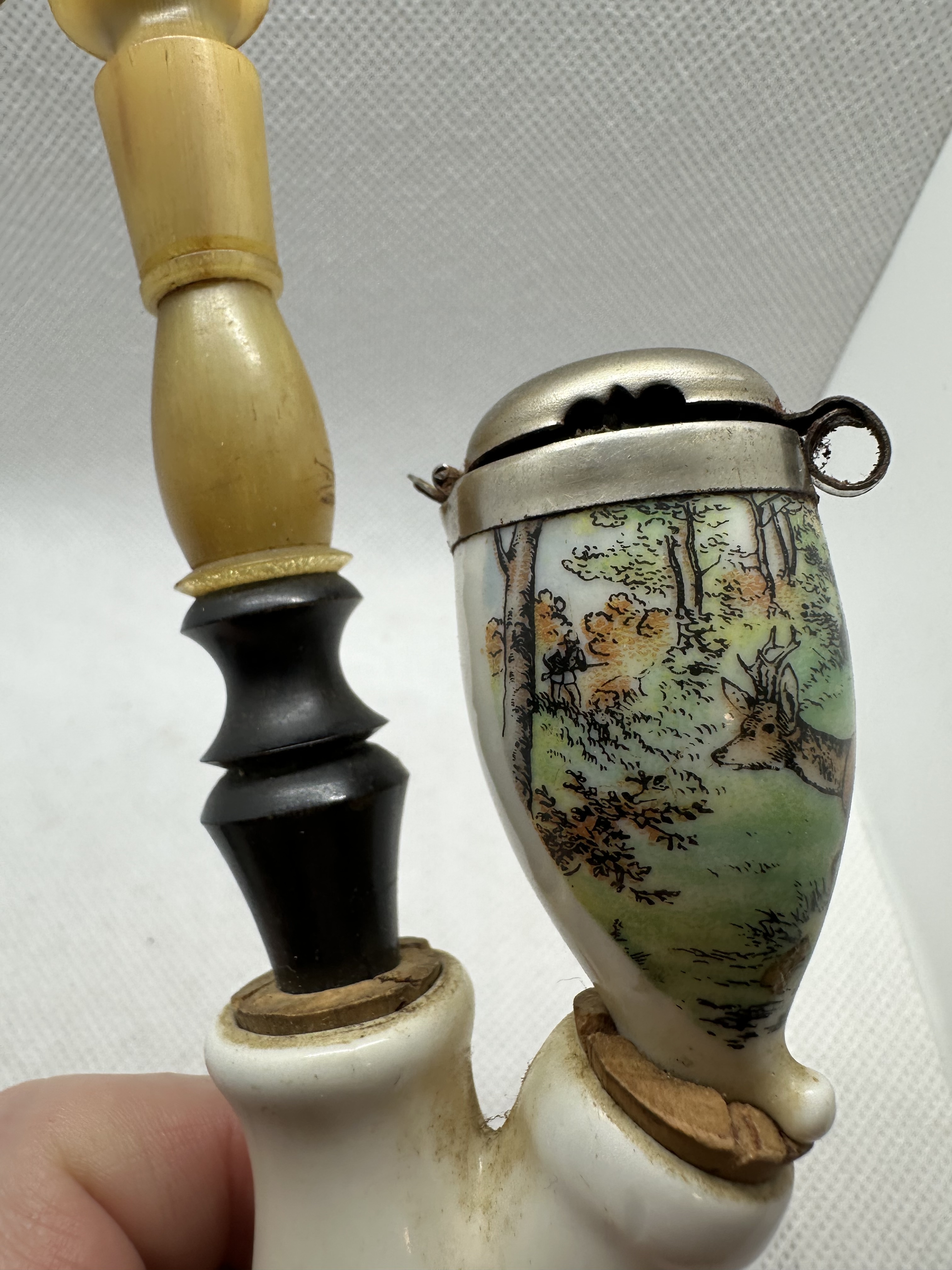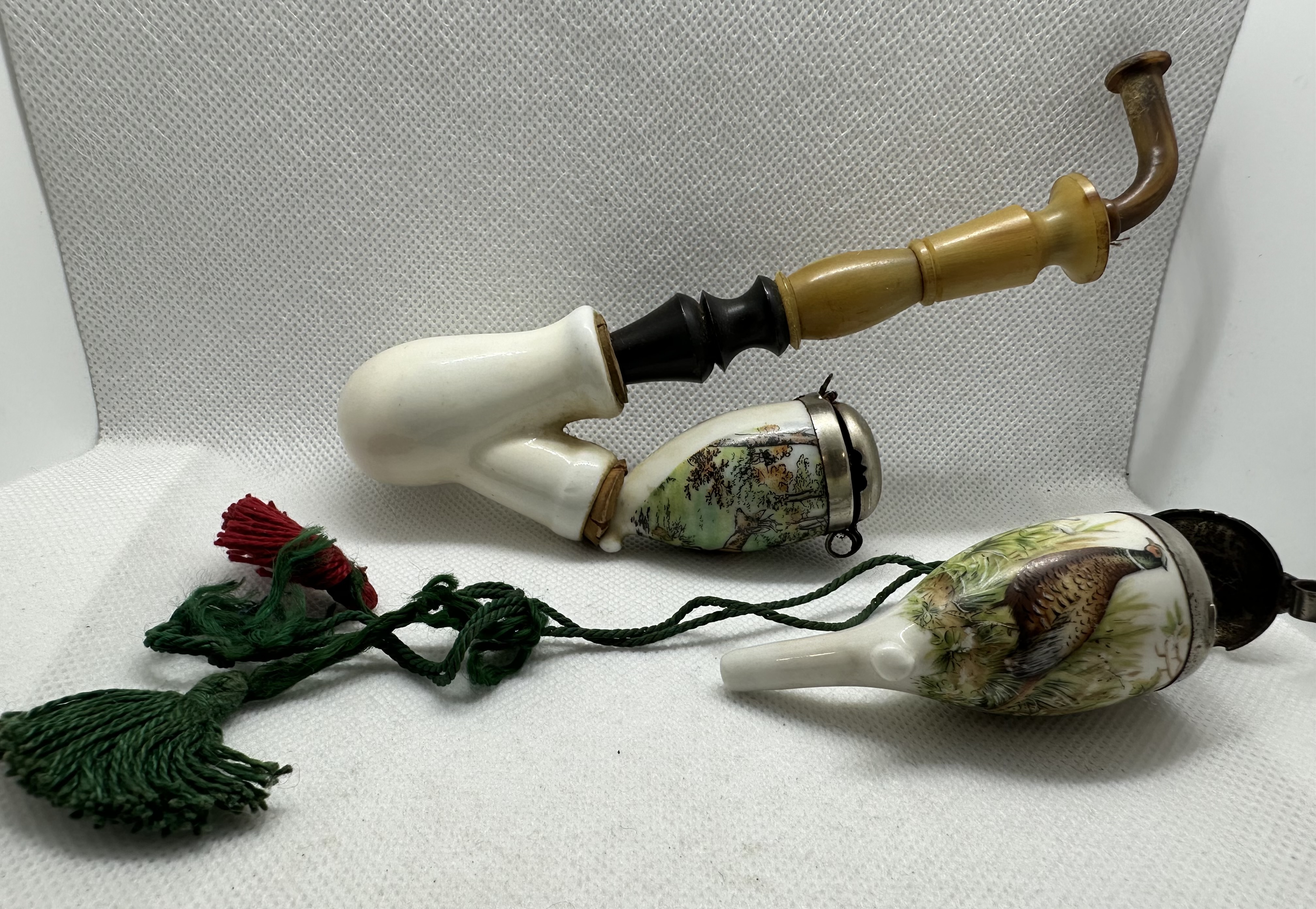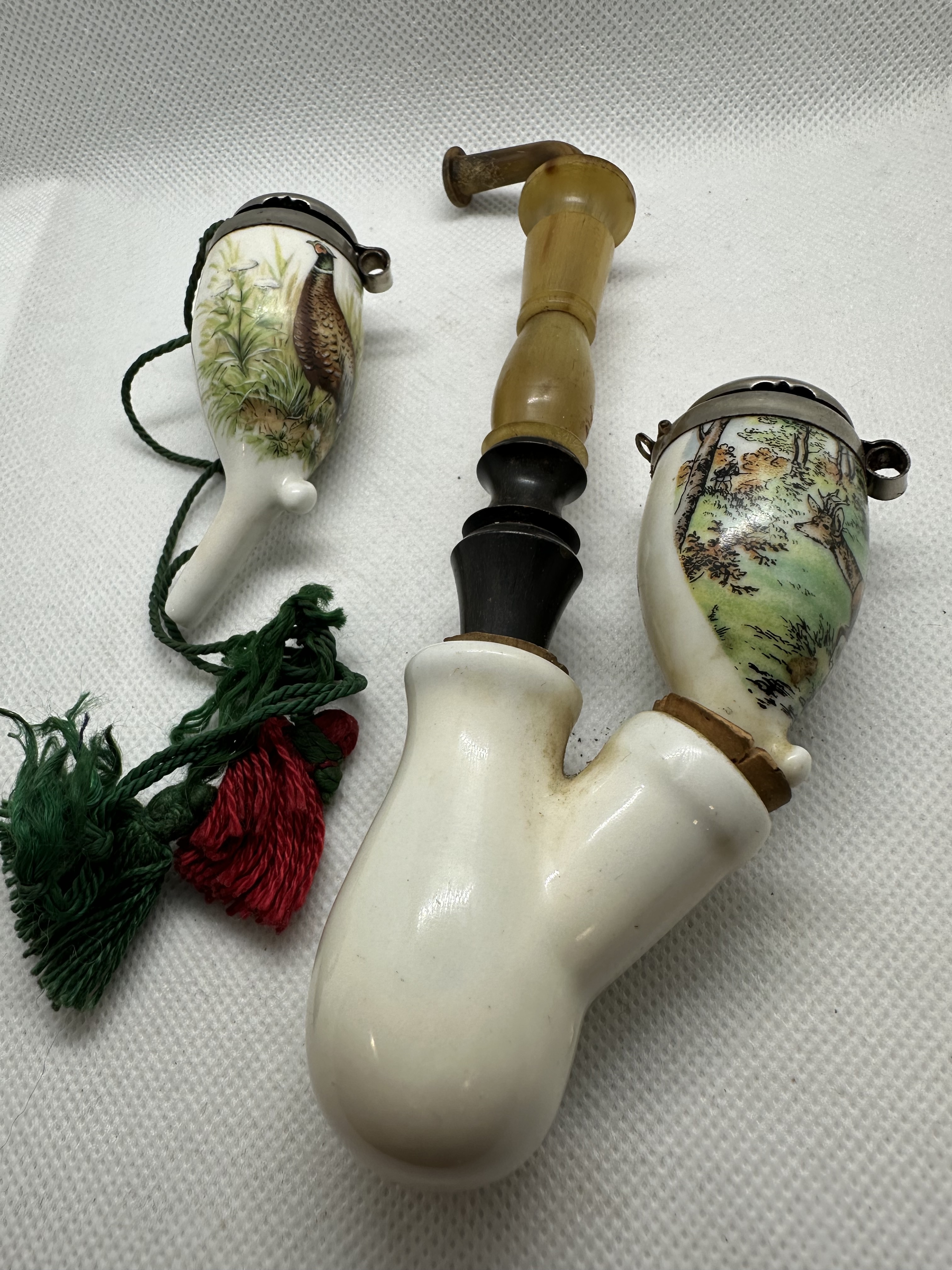 Antike Gesteckpfeife mit zwei Porzellanköpfen Jagdmotiv (Reh, Auerhahn)