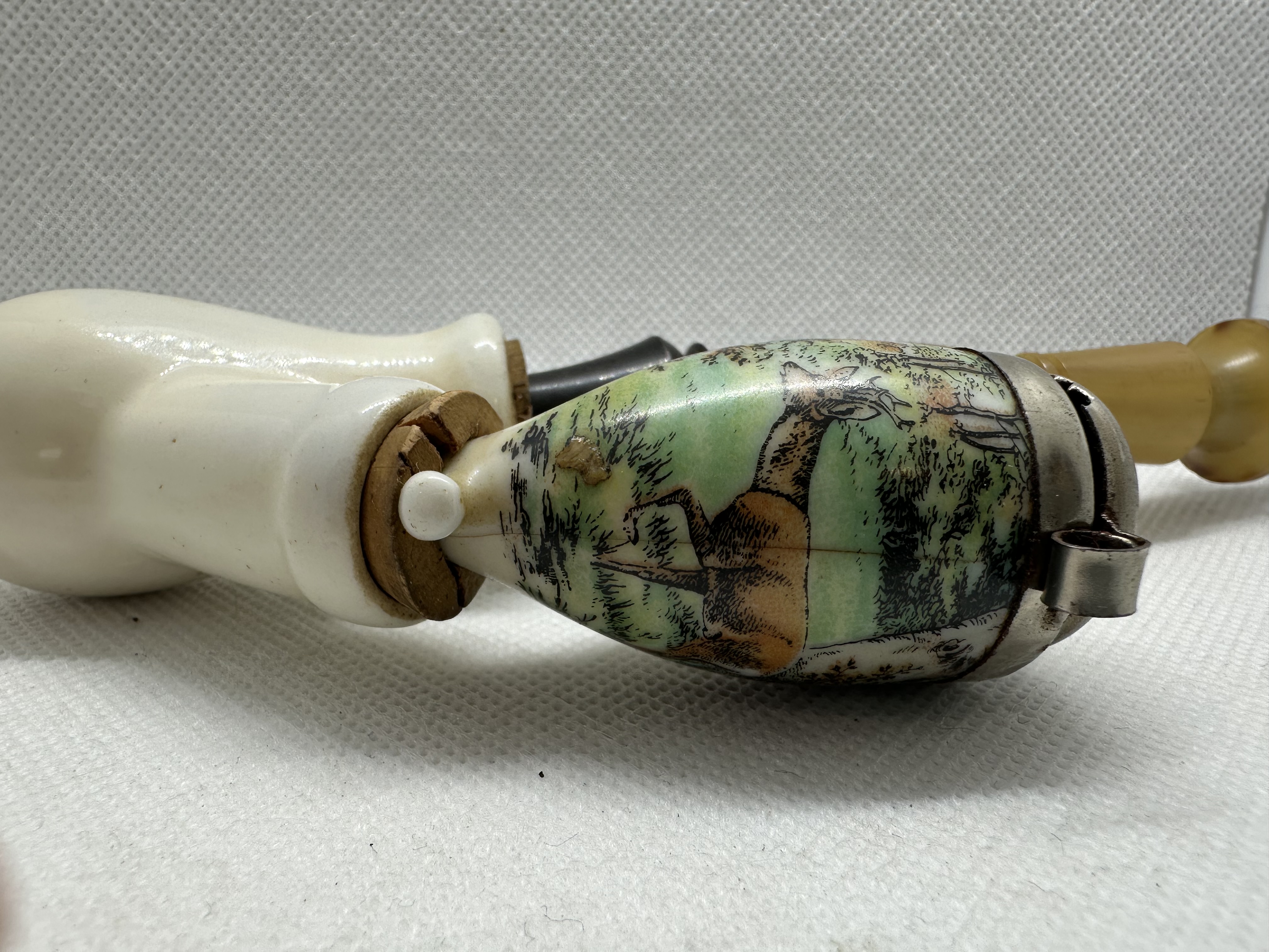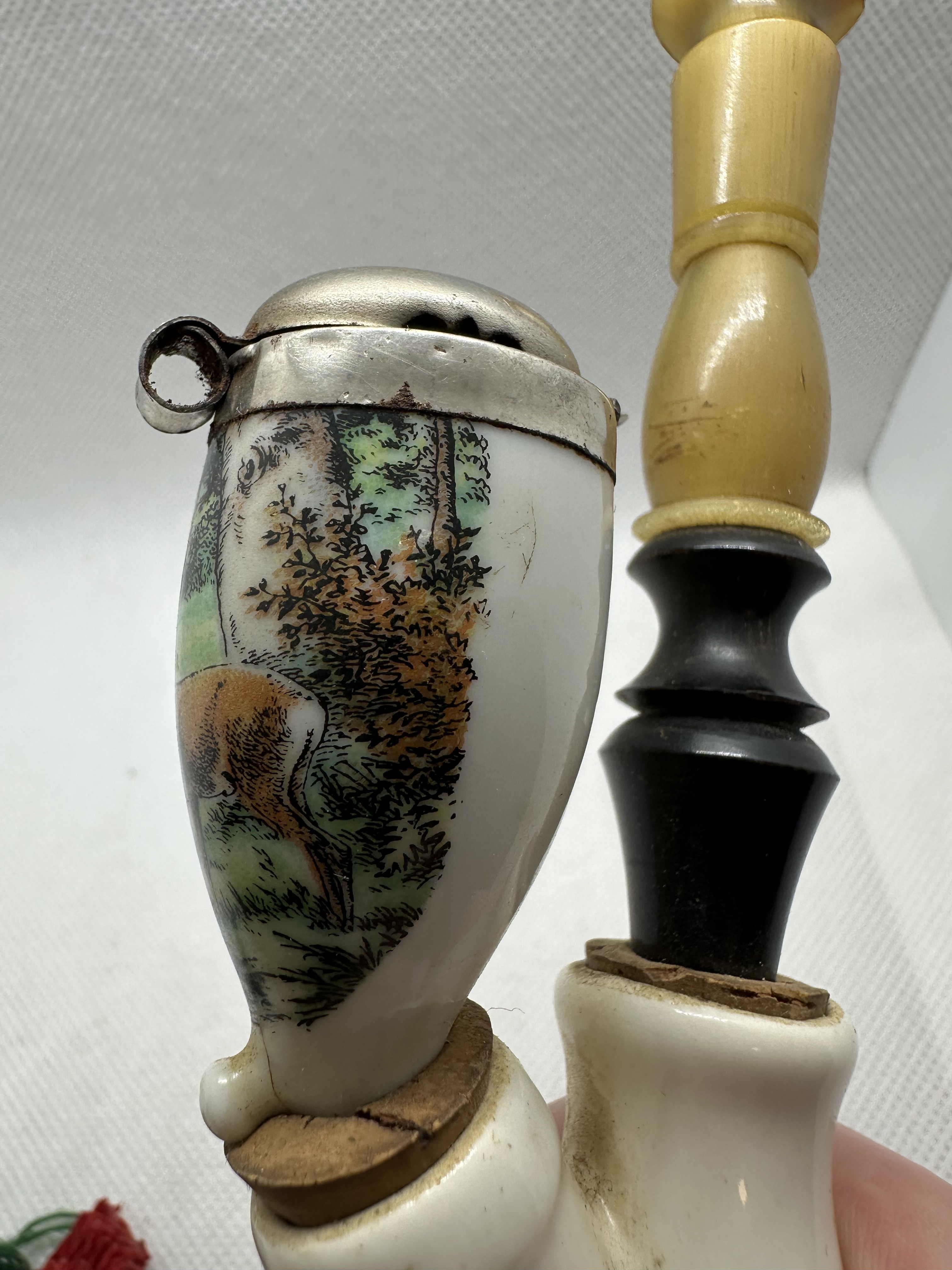 Antike Gesteckpfeife mit 2 verschiedenen Porzellanköpfen - Jagdmotiv