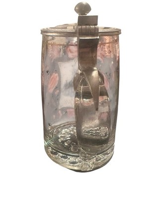Dekorativer und sammelwürdiger antiker Deckelhumpen aus farblosem Glas mit originalem Zinndeckel. Das Glas ist aufwendig mit floraler Emaillemalerei in zarten Rosa- und Blautönen verziert. Im Zentrum befindet sich ein fein ausgearbeitetes Medaillon mit der Darstellung des Lamm Gottes, ergänzt durch religiöse Symbolik und ornamentale Details.