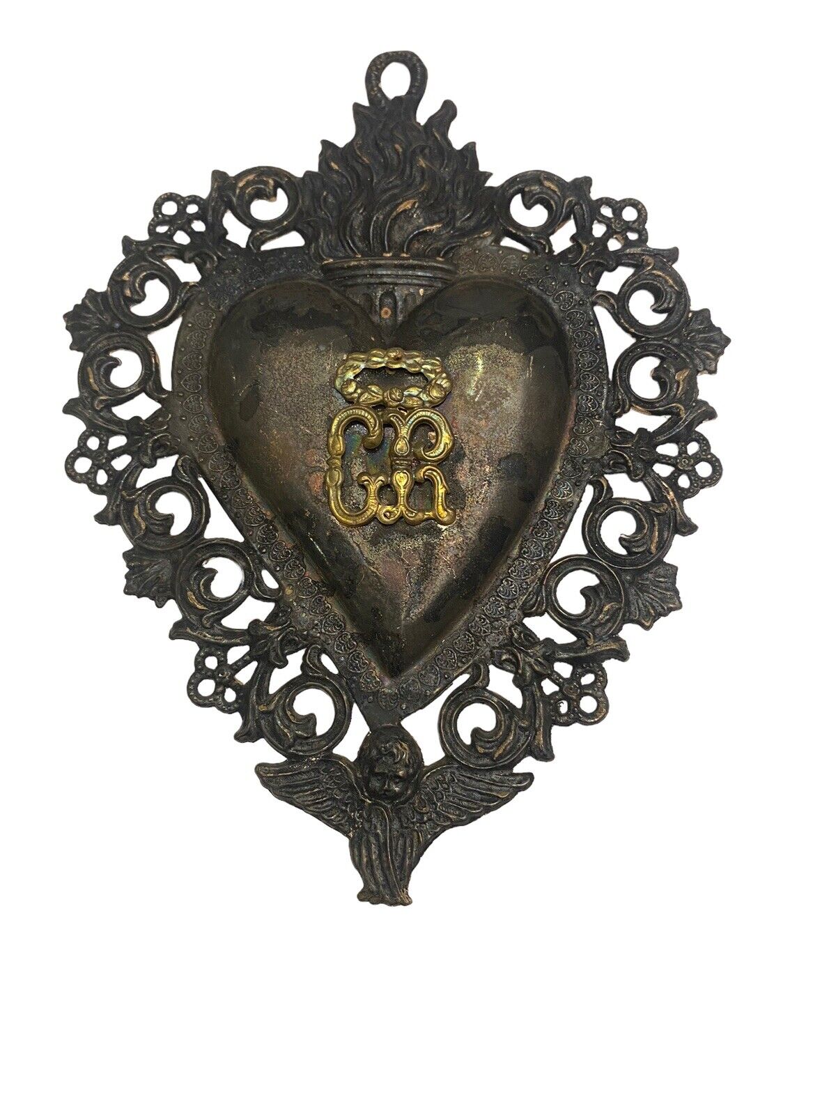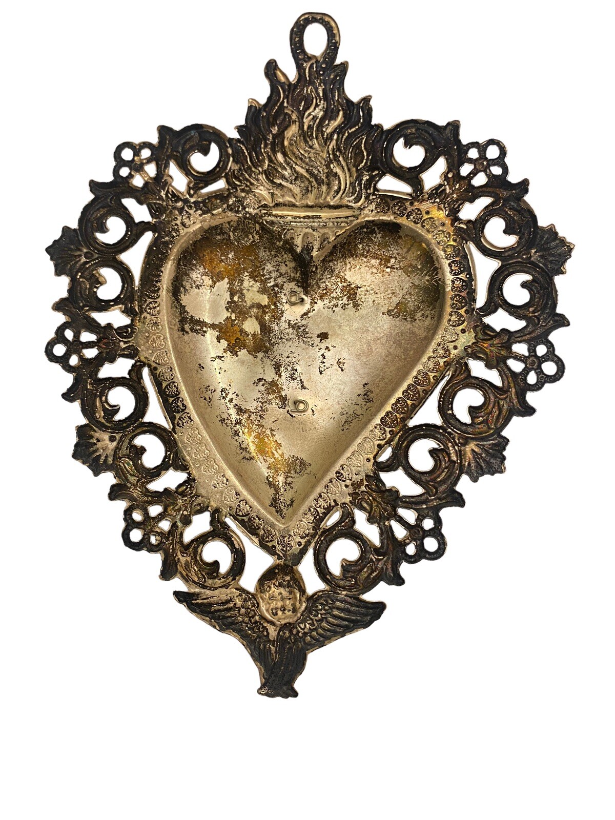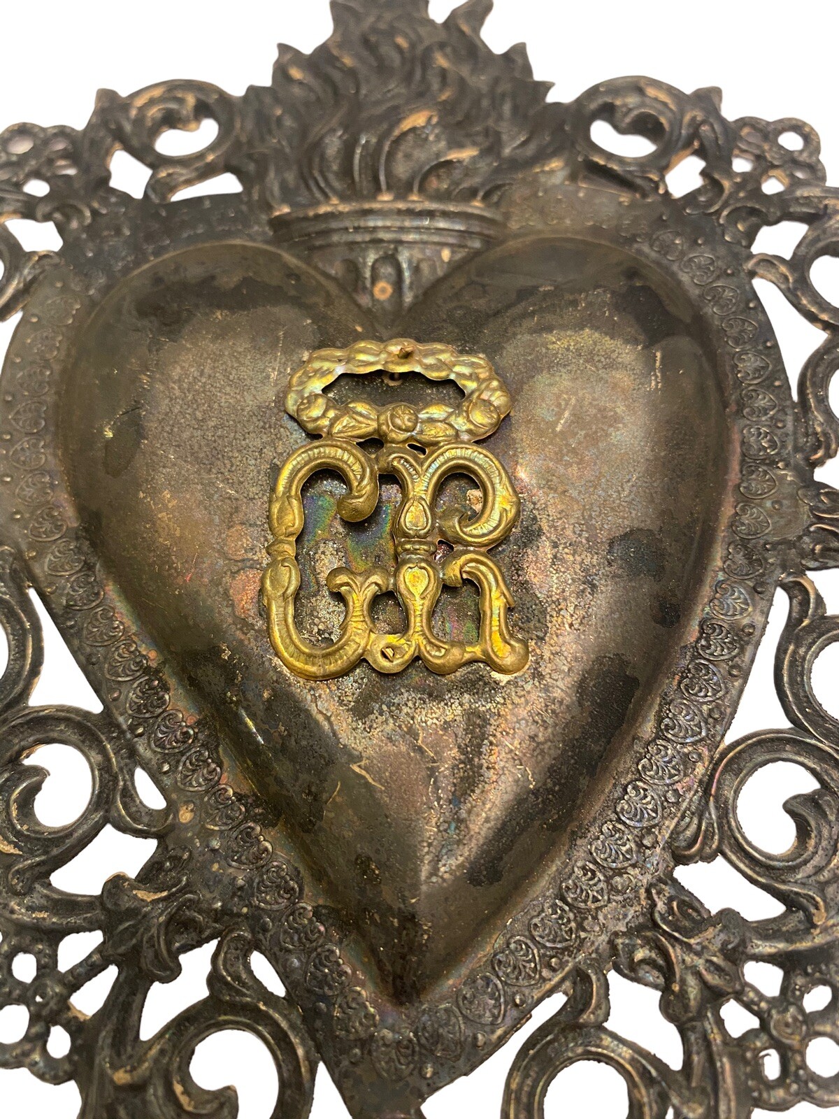 Antikes Flammendes Herz Klosterarbeit Votiv Herz 16.5 X 13.5 cm 500099