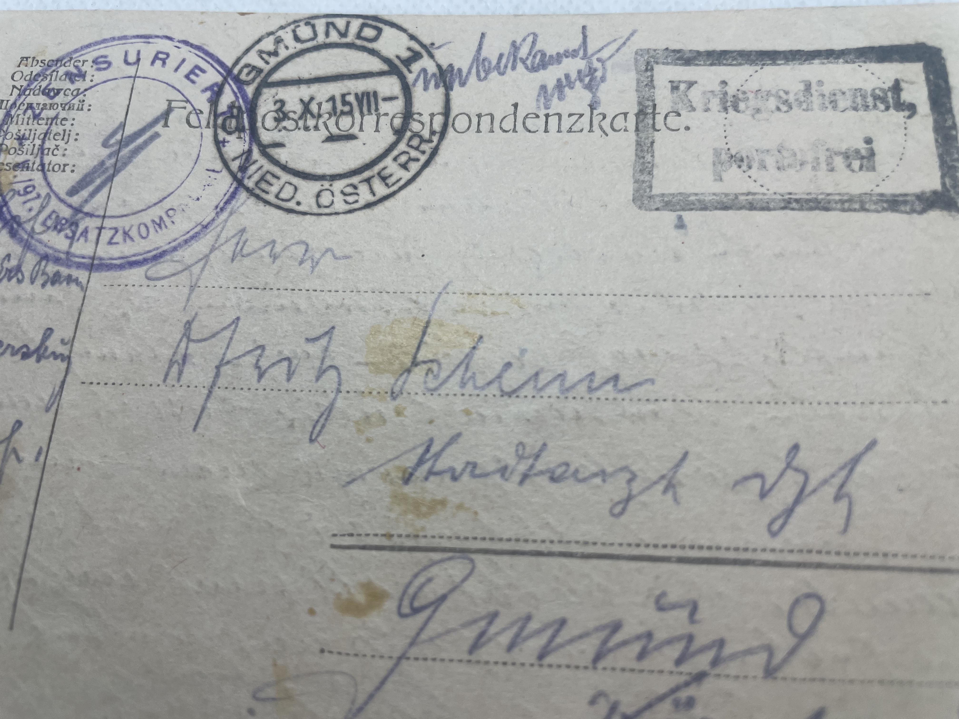 Feldpost Korrespondenzkarte mit Zensurstempel von 1915