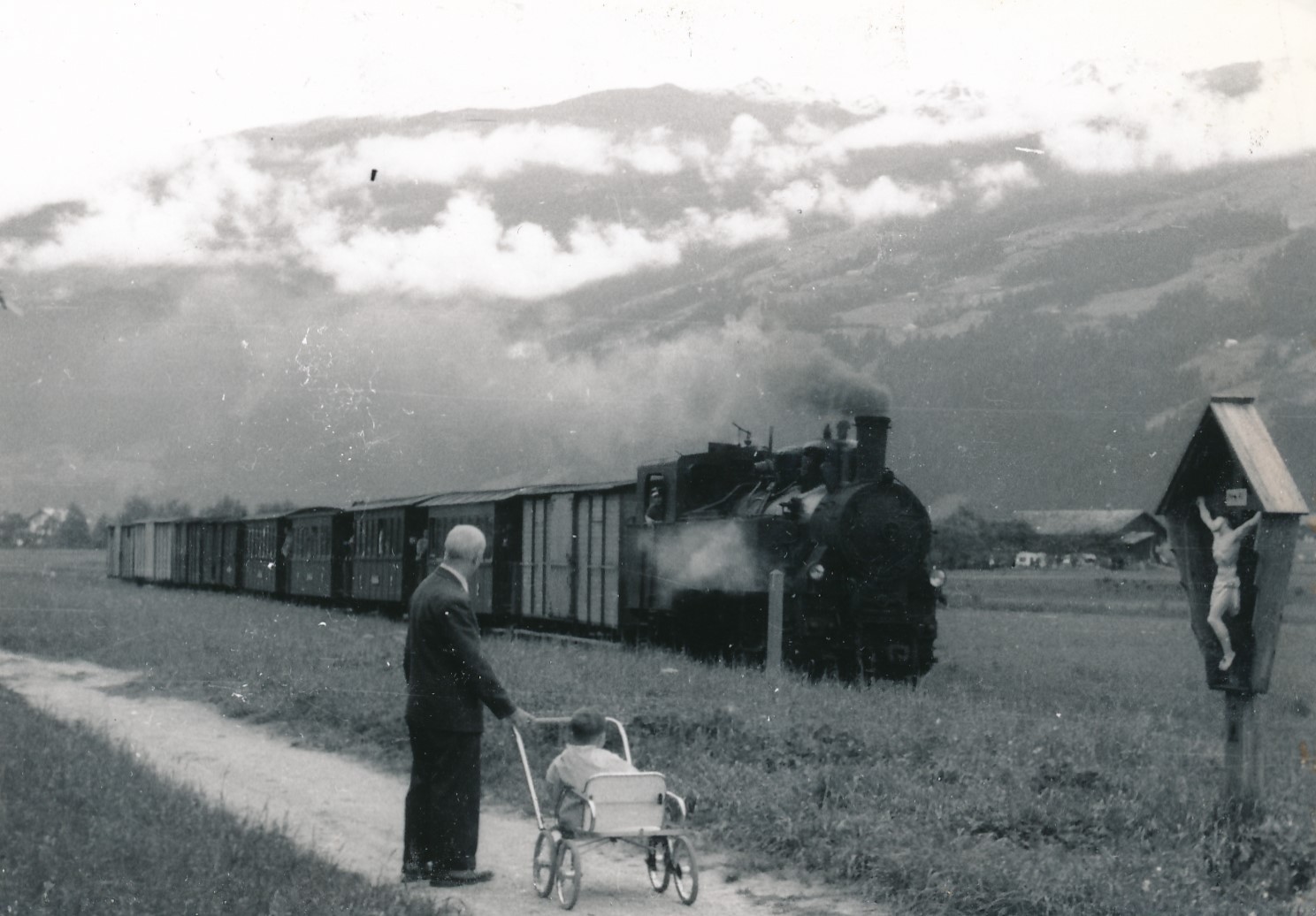 Foto von einer alten Dampflock mit Mann und Kind (18156)