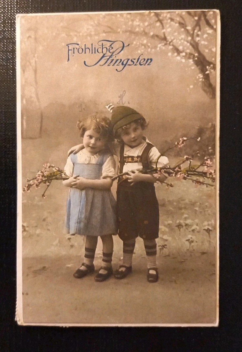 Fröhliche Pfingsten Kleines Mädchen Kleiner Bub Mit Zweige Gr