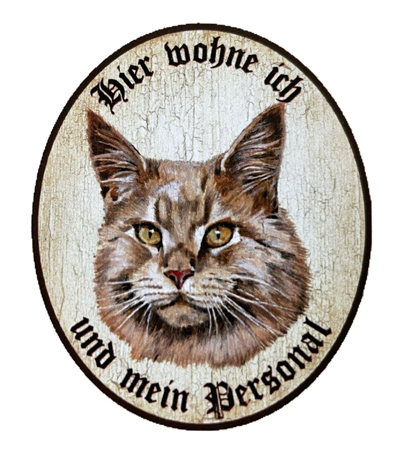 KuK Nostalgie Holzschild "Hier wohne ich und mein Personal“ Katze Maine Coon