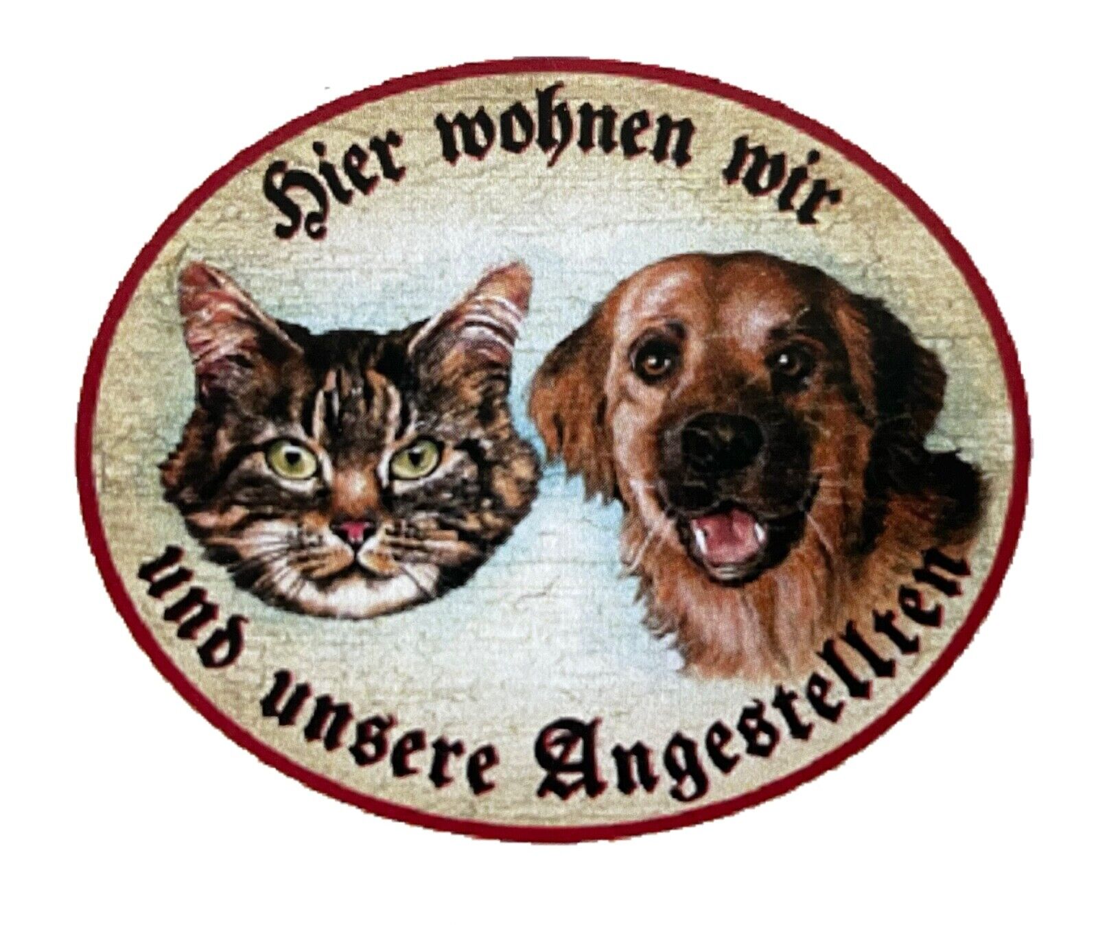 KuK Nostalgie Holzschild "Hier wohnen wir u.u. Angestellte“ Katze Hund Duo