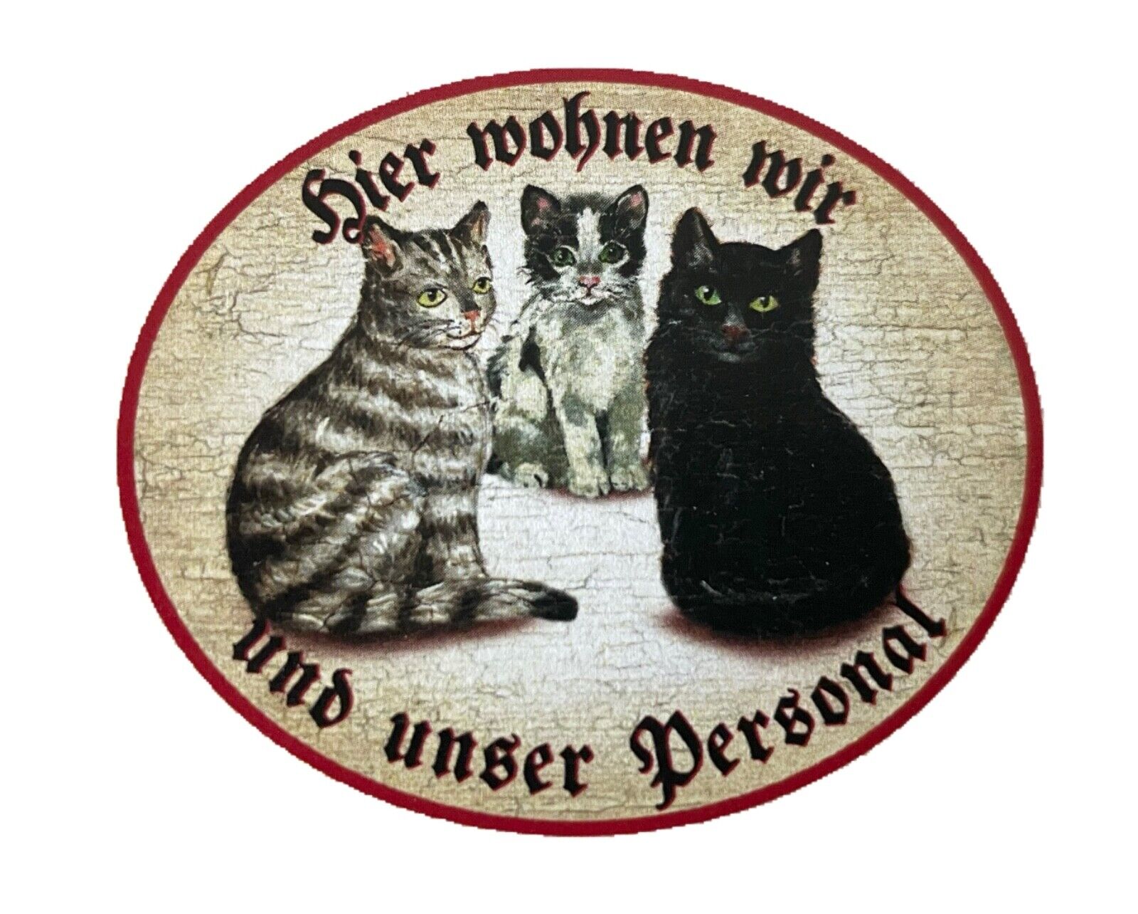 KuK Nostalgie Holzschild "Hier wohnen wir u.u. Personal“ Trio Katze Tabby SW