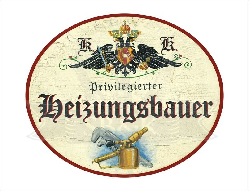 KuK Nostalgie Holzschild - Privilegierter Heizungsbauer - Werkzeug TH