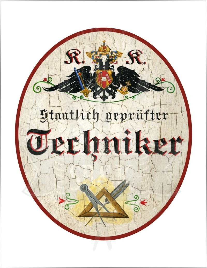 KuK Nostalgie Holzschild - Staatlich geprüfter Techniker - Zirkel Feder TH