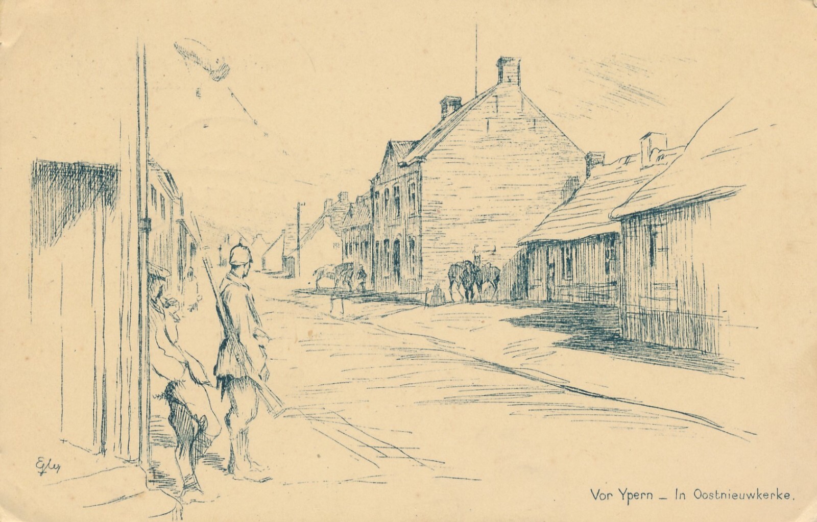 Künstler Karte vor Ypern - In Oostnieuwkerke mit Soldaten Ansichtskarte (13891)