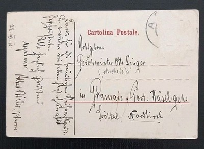 Auf der Rückseite befindet sich eine handschriftliche Nachricht von 1910, adressiert an die Geschwister Otto Singer, Hotelgäste in Pramau, Vorarlberg. Der historische Postverkehr zwischen Italien und Österreich verleiht der Karte zusätzlich dokumentarischen Wert. Hergestellt wurde sie von Lanz & Sonsbeck, Darmstadt, einem bekannten Verlag für hochwertige, künstlerisch gerahmte Drucke.