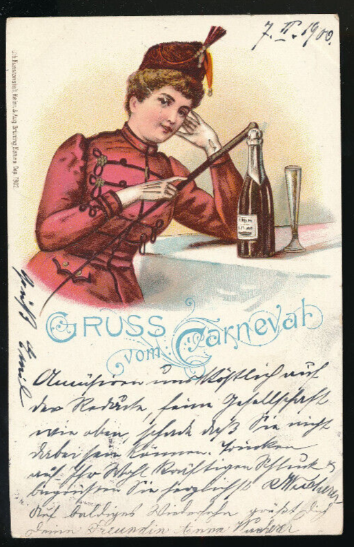Litho-Karte gruss vom Carneval Frau mit Champagner Flasche (1917)