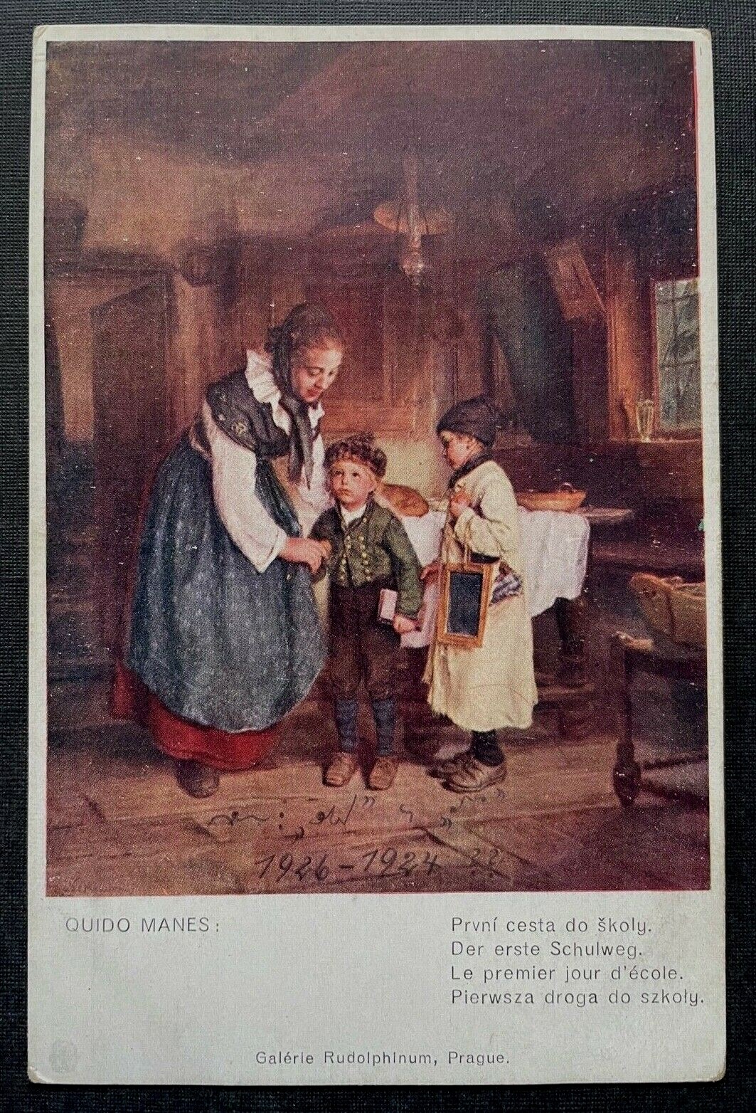 Malerei Der erste Schulweg Q.Manes Schulkinder Mutter Kleid Tracht 400292 TH A