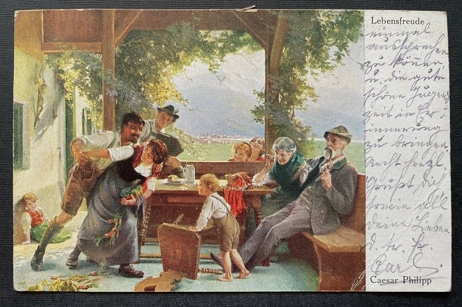 Malerei Lebensfreud C.Philipp Familie Feier Kleid Tracht Hut Bart Kind 400344 TH