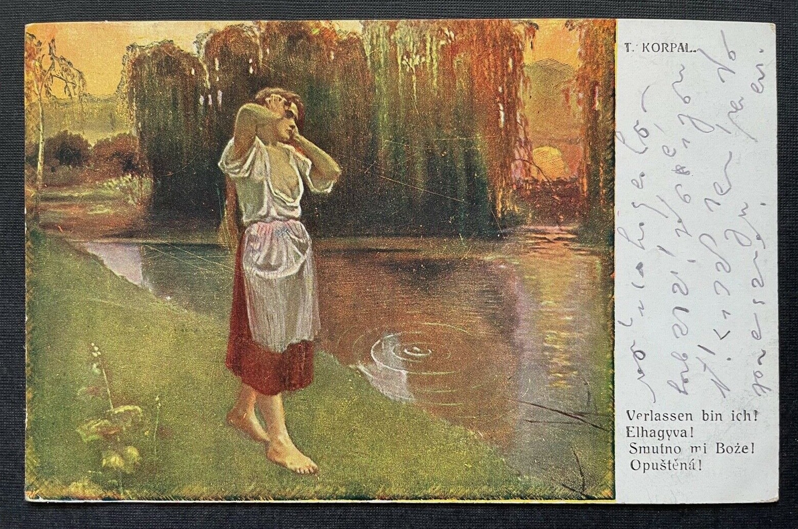 Malerei Verlassen bin ich T.Koral Frau Kleid Liebe Einsamkeit See Park 410776 TH