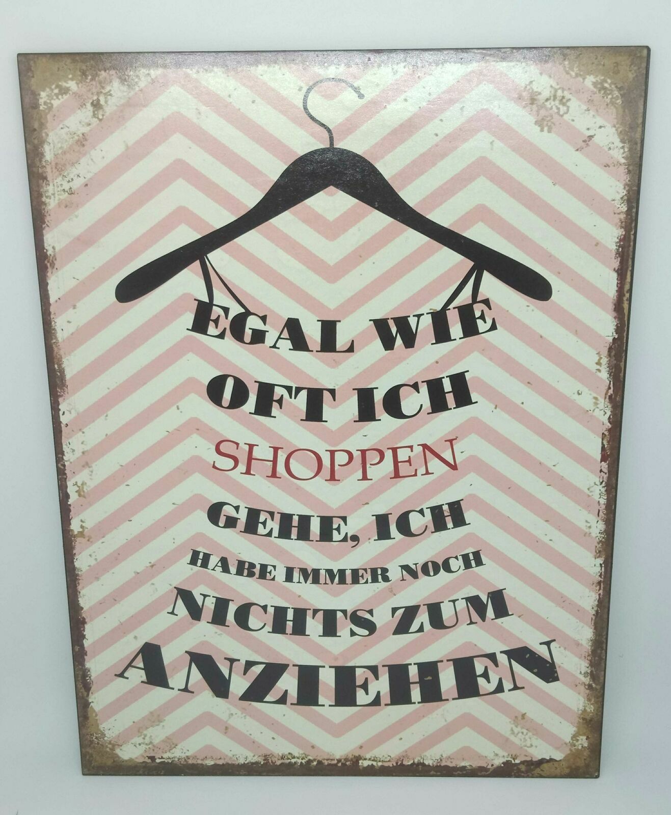 Nostalgie Retro Blechschild "Egal wie oft ich shoppen gehe..." rosa 35x26 50518