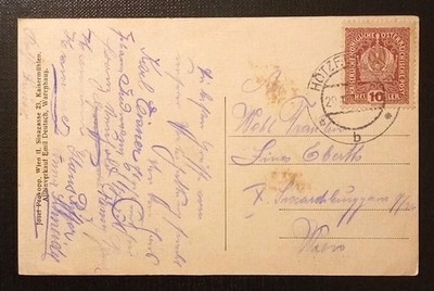 Die Karte ist gelaufen, frankiert mit einer 10-Heller-Marke der K.u.k. Monarchie und trägt einen gut lesbaren Stempel. Die Rückseite zeigt eine dichte, persönliche Nachricht in violetter Tinte – ein authentisches Zeitzeugnis aus der kaiserlich-königlichen Zeit.