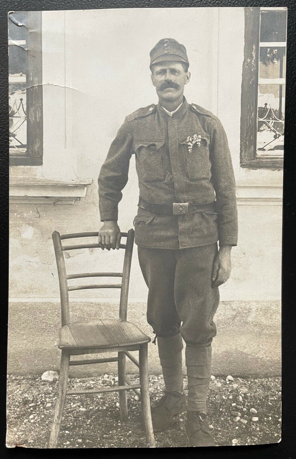 Porträt Soldat Uniform Feldkappe Bart Stuhl Blume Stiefel Militär Krieg 400614TH