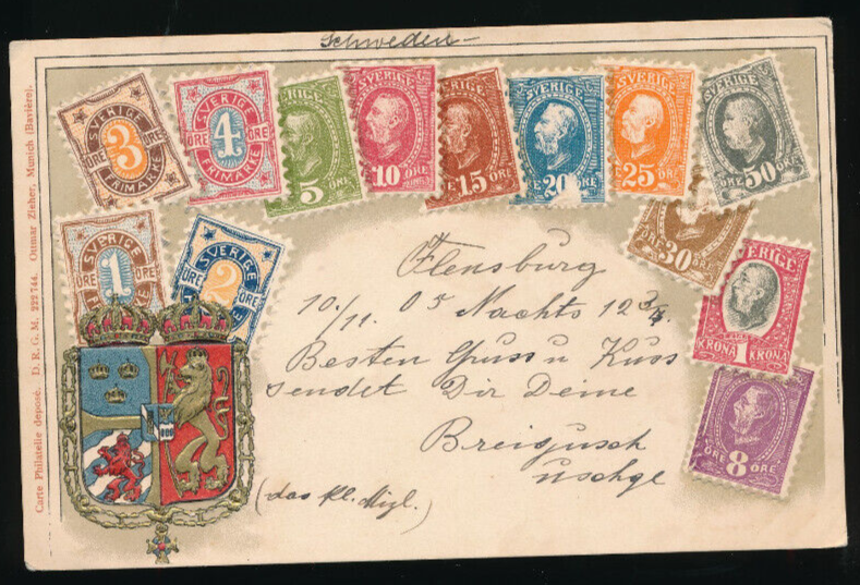 Präge-Litho-Karte Schweden mit Wappen und Marken (2749)