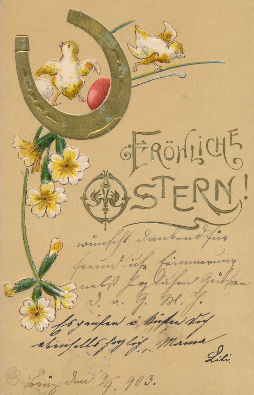 Präge - Motiv - Karte Frohe Ostern mit Hufeisen und Kücken Ansichtskarte (12654)
