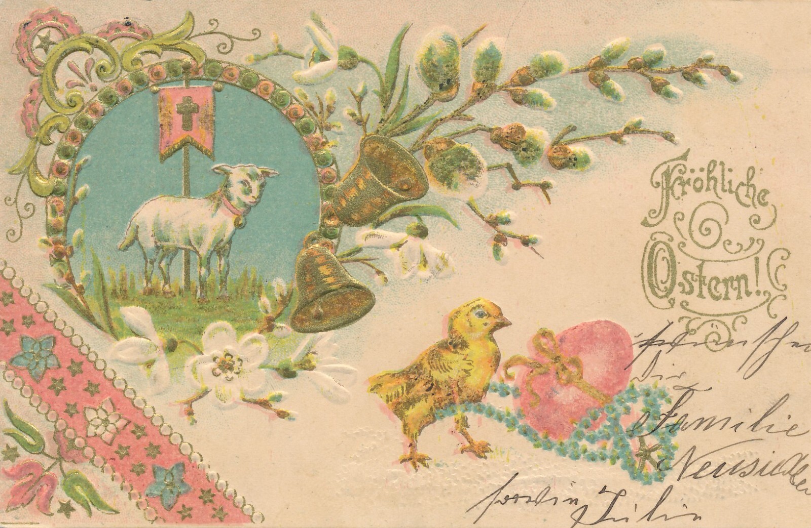 Präge - Motiv - Karte Fröhliche Ostern mit Lamm und Kücken Ansichtskarte (11854)