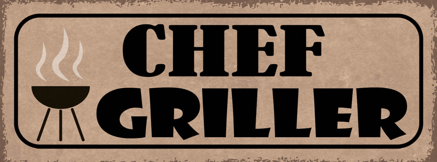Schild Chef Griller Grillen Grill BBQ Party Koch Kochen 27x10 Blech od.Holz